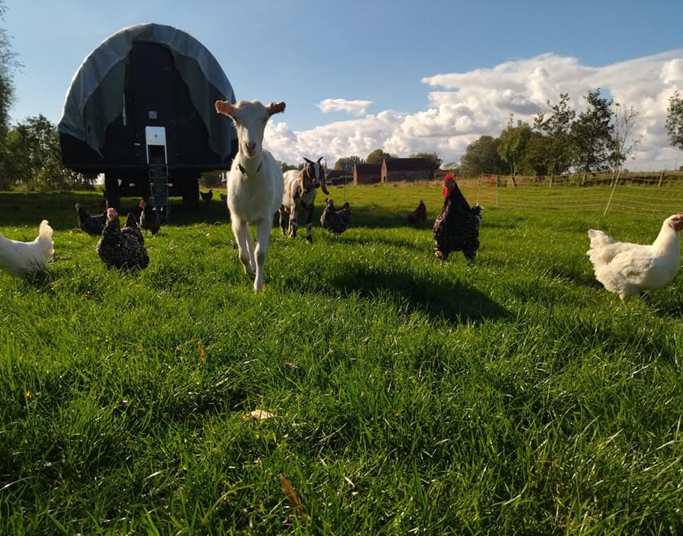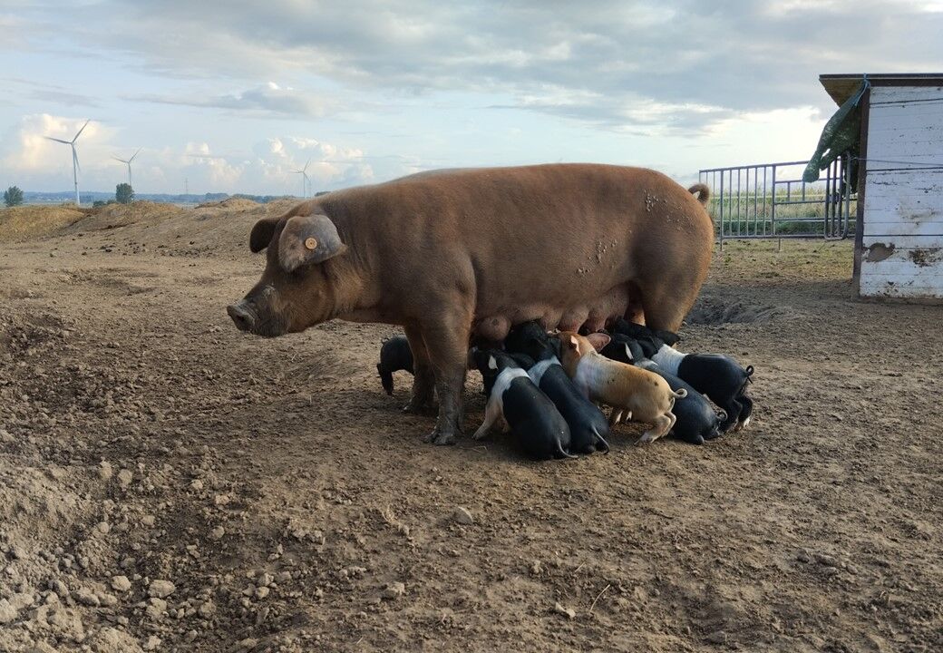 Ferme bio diversifiée Porcs plein air, croisement d’une variété ibérique et Duroc.
