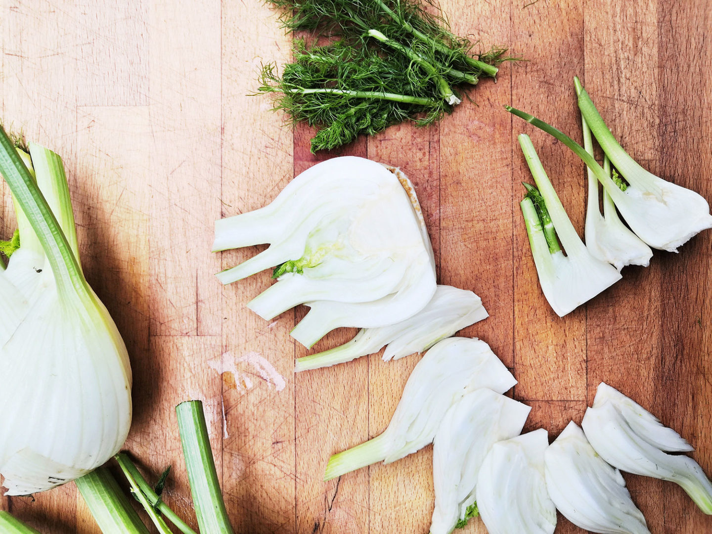 Le fenouil est un bulbe qui se consomme du début de l’été à la fin de l’automne. Il a tout pour lui, un goût anisé qui rappelle un peu l’été, comestible du bulbe aux feuilles et aussi bon cru que cuit. - Huile de pépin de raisin pour la cuisson (sans goût afin de ne pas altérer celui du fenouil)