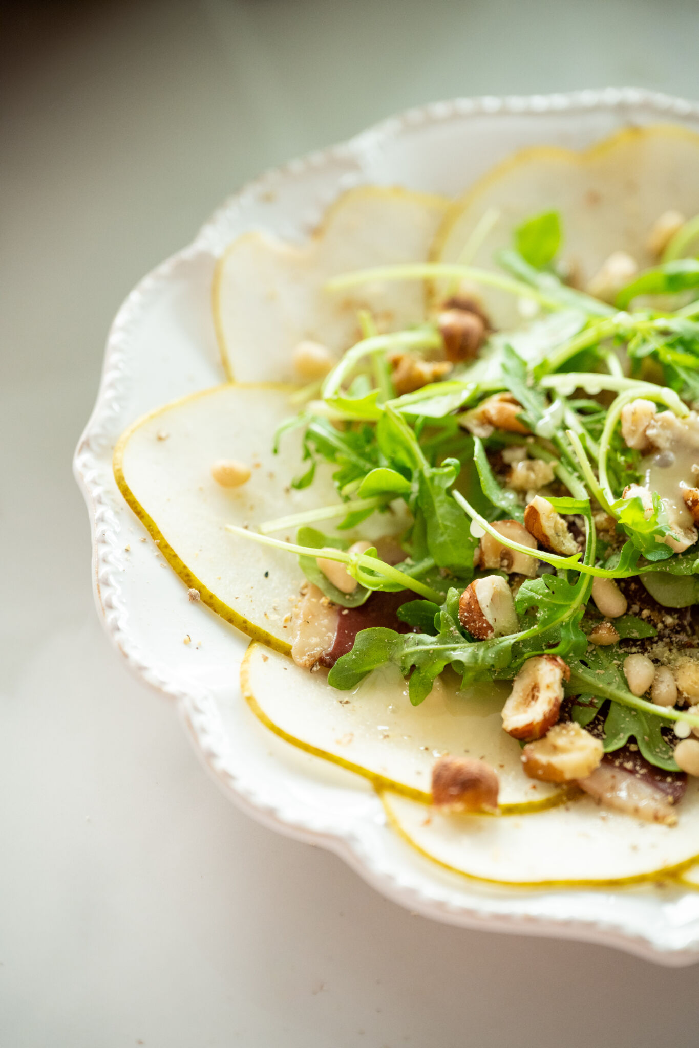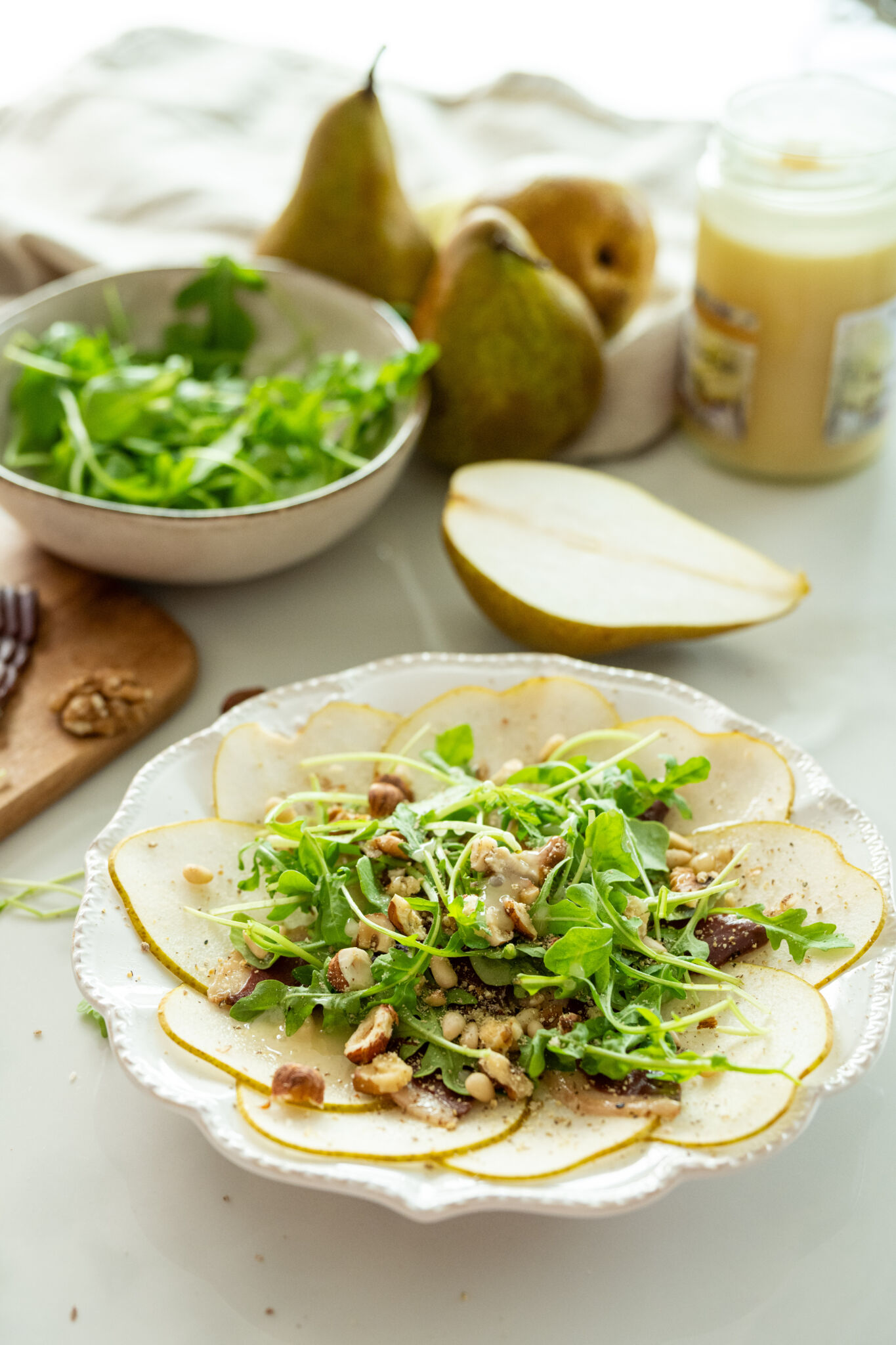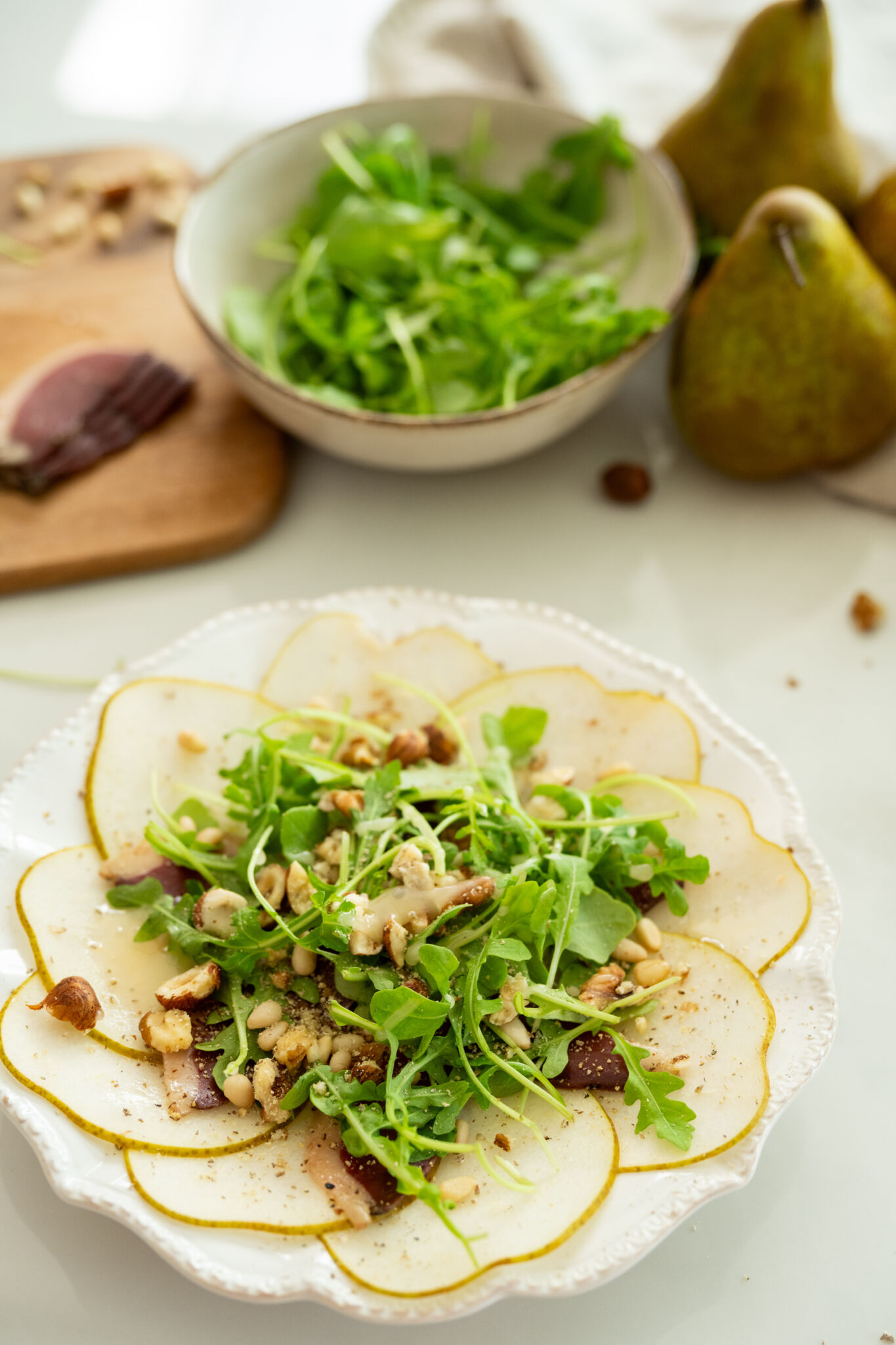 Nous, nous adorons les recettes qui allient simplicité et raffinement. Ce carpaccio de poires, magret de canard, roquette, noix et miel est un incontournable de l'automne. C'est l'occasion idéale de visiter votre producteur de fruits, votre apiculteur ou votre ferme locale pour vous procurer des ingrédients de première qualité. Il suffit de quelques minutes pour assembler ces saveurs complémentaires : le salé du canard, le sucré du fruit et le piquant des feuilles. Une entrée simple à préparer, parfaite pour les repas d’automne où l’on aime se régaler sans passer des heures en cuisine.