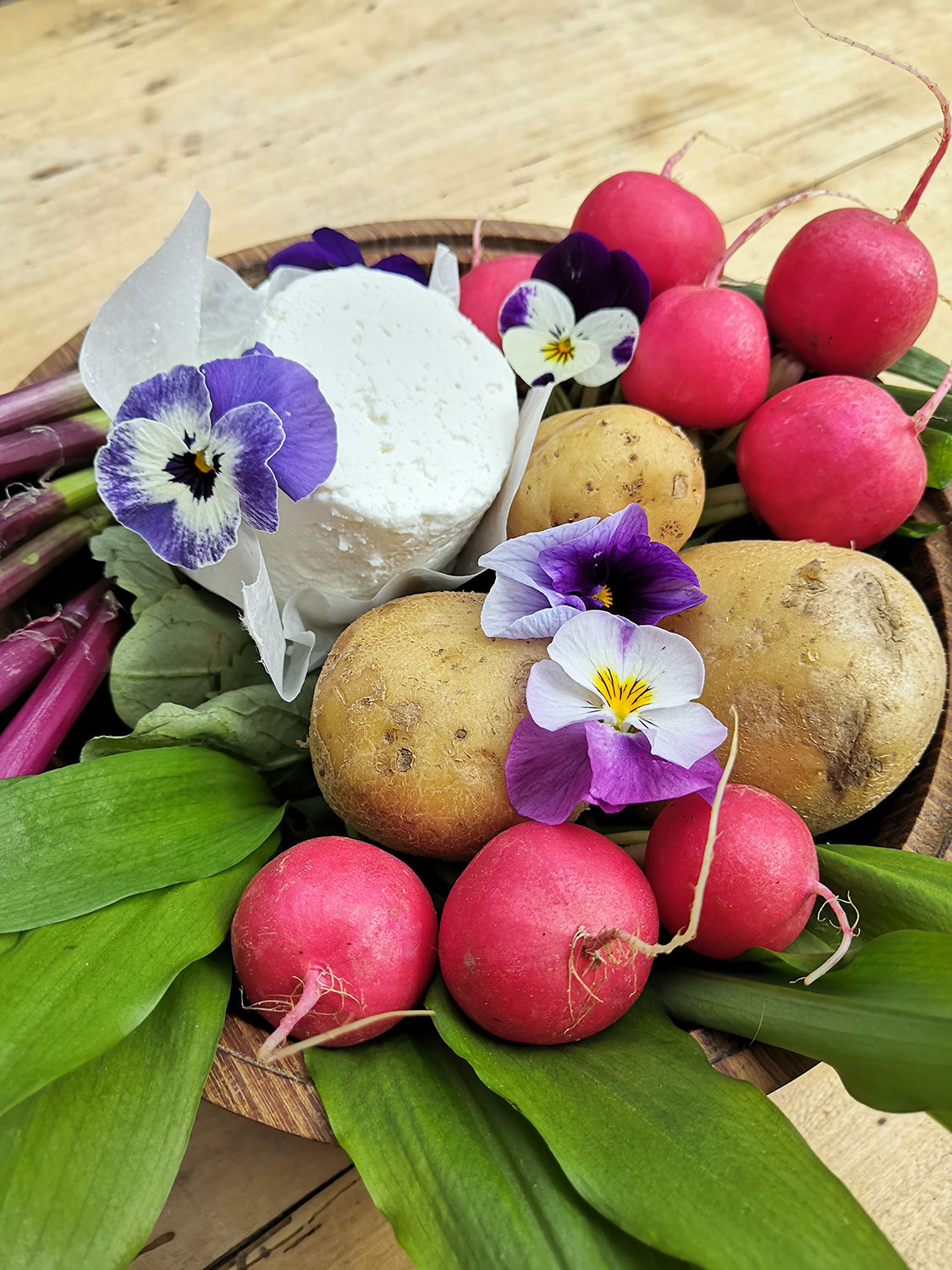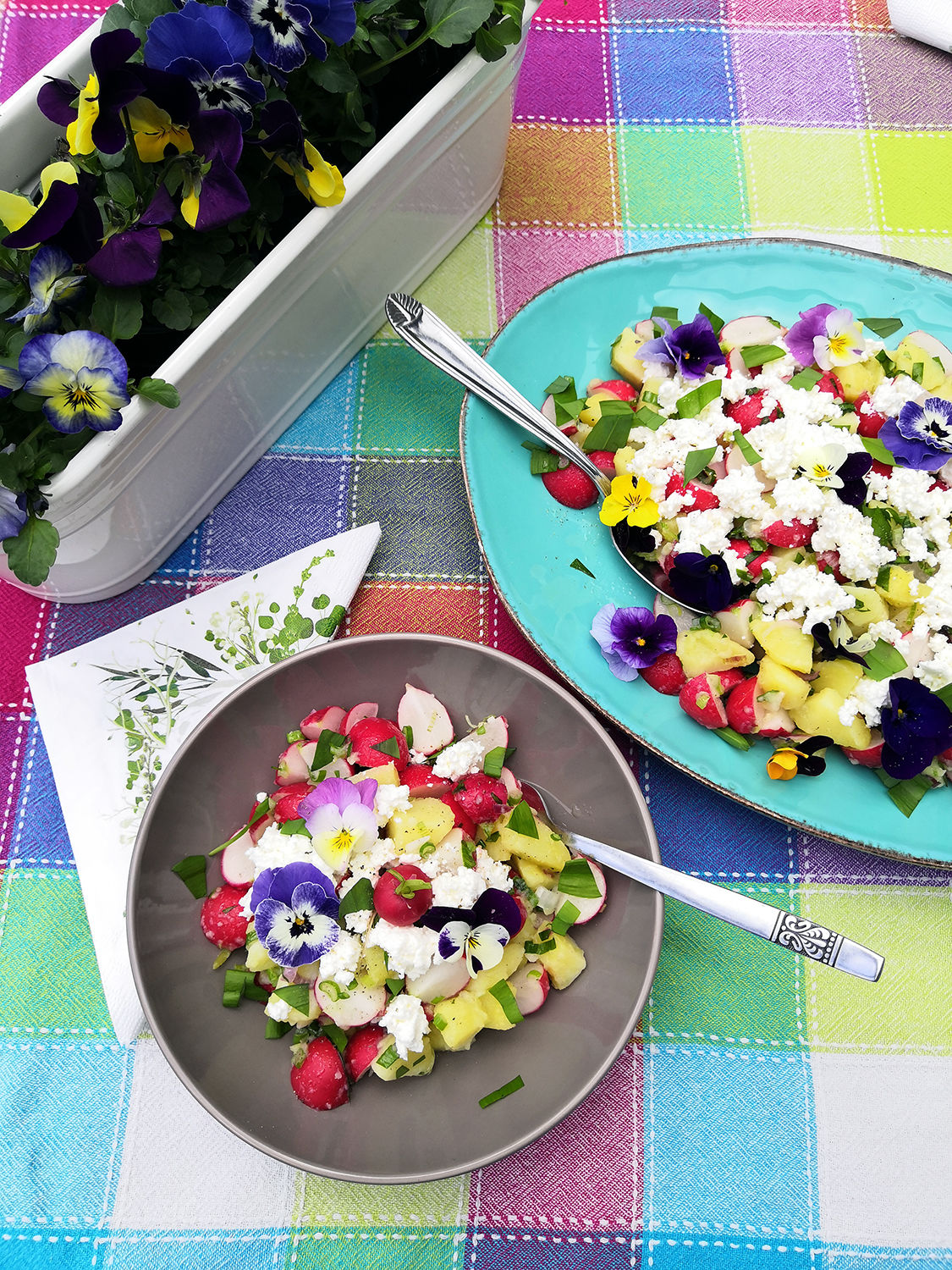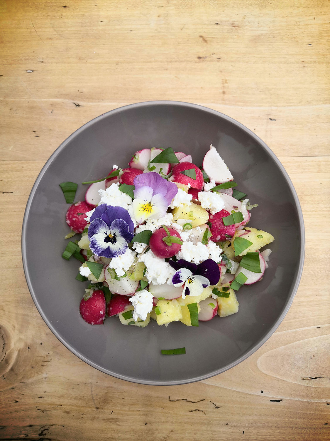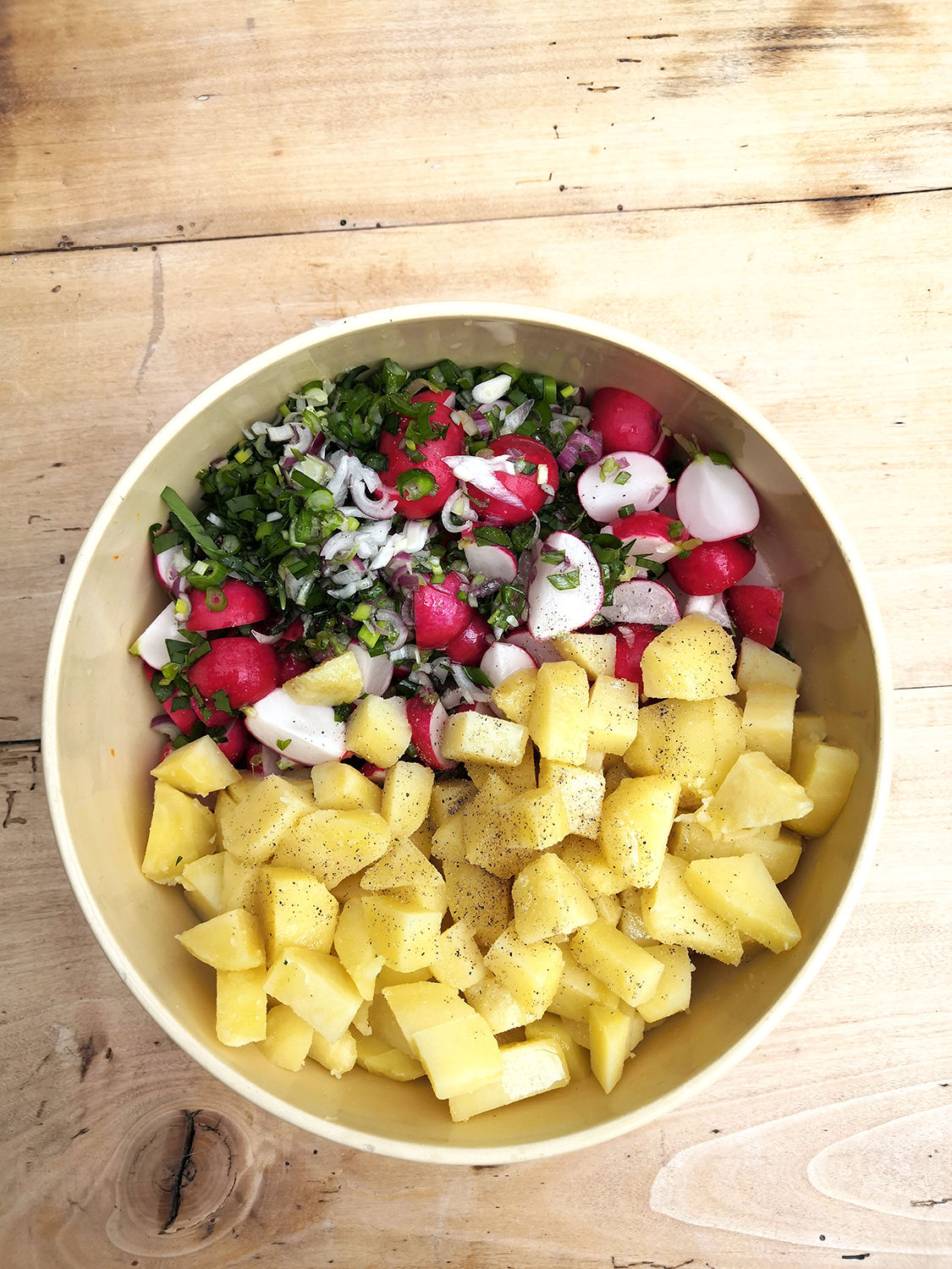 - Dans un saladier, mélanger les pommes de terre, les radis, les jeunes oignons, l’ail des ours et assaisonner avec l’huile, le citron, le sel et le poivre.