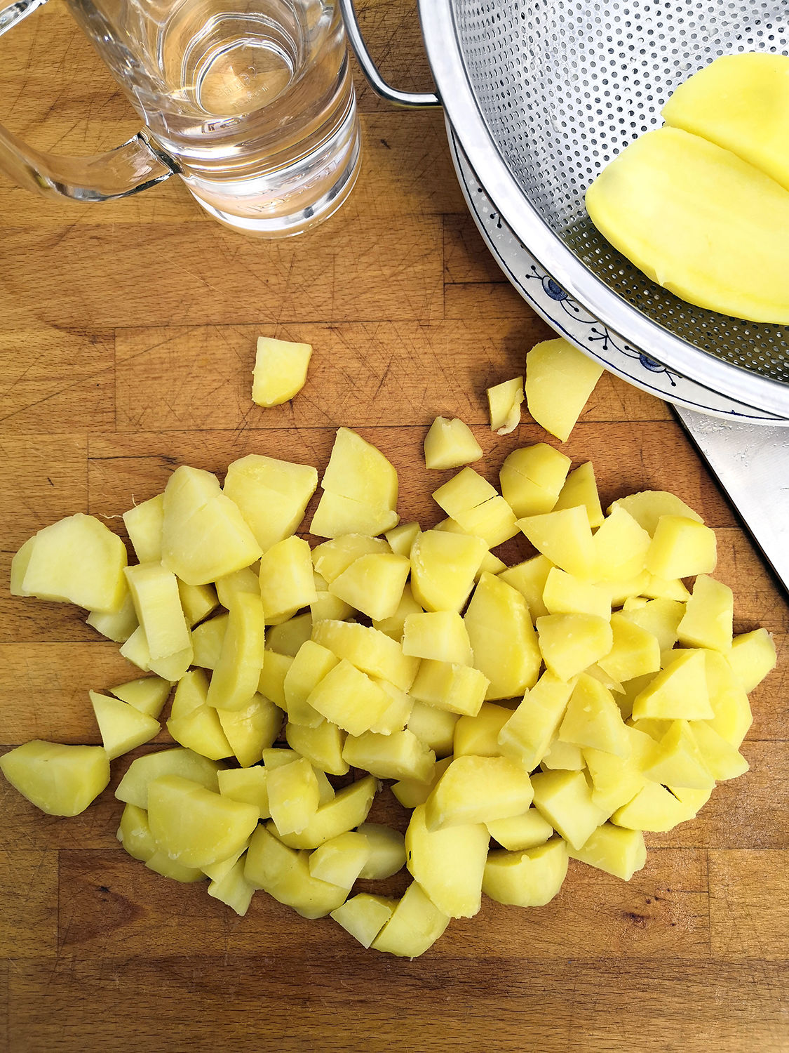 - Eplucher les pommes de terre et les cuire vapeur. Mettre à refroidir.