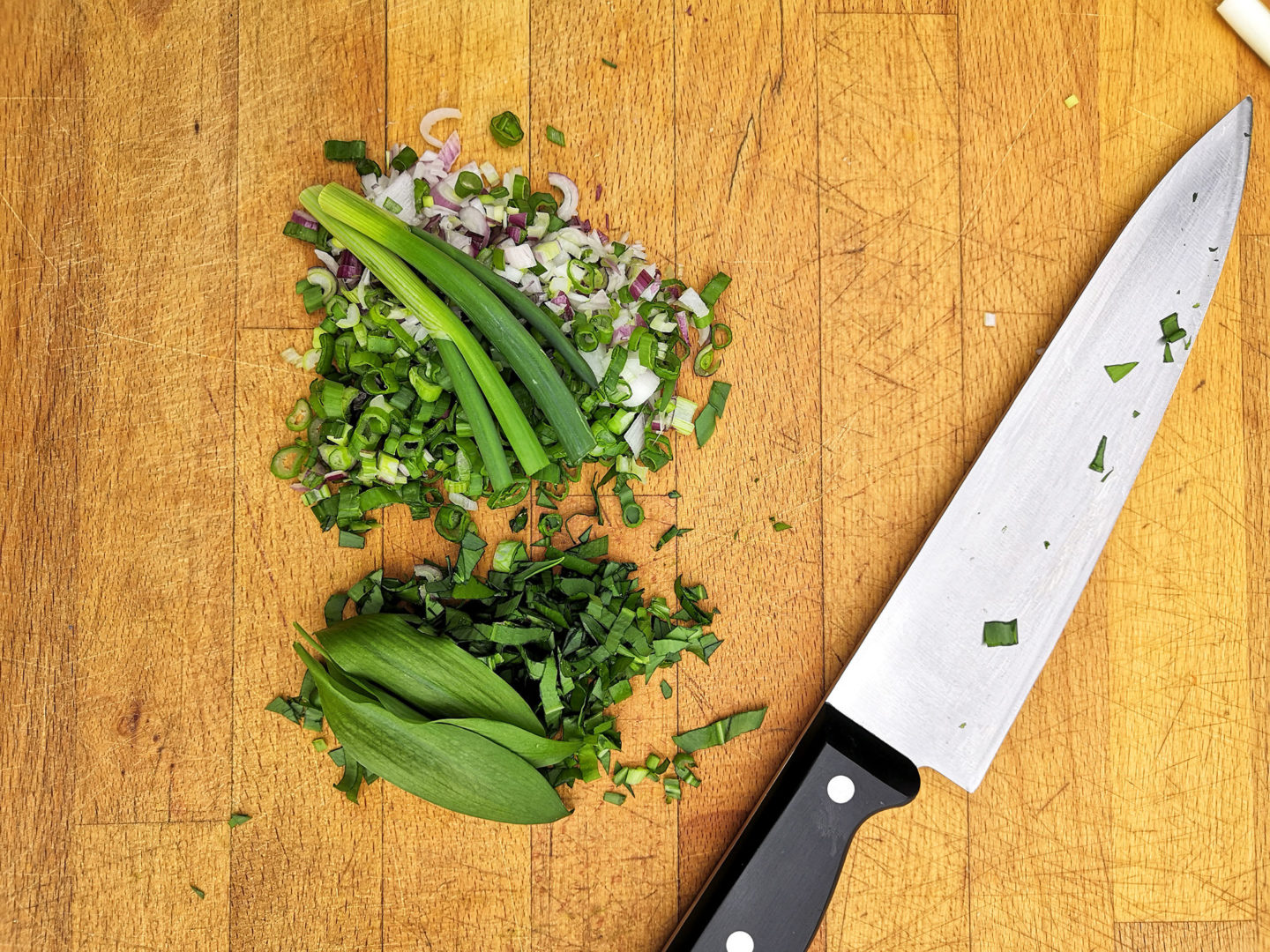 - Nettoyer, laver et hacher les jeunes oignons et l’ail des ours.