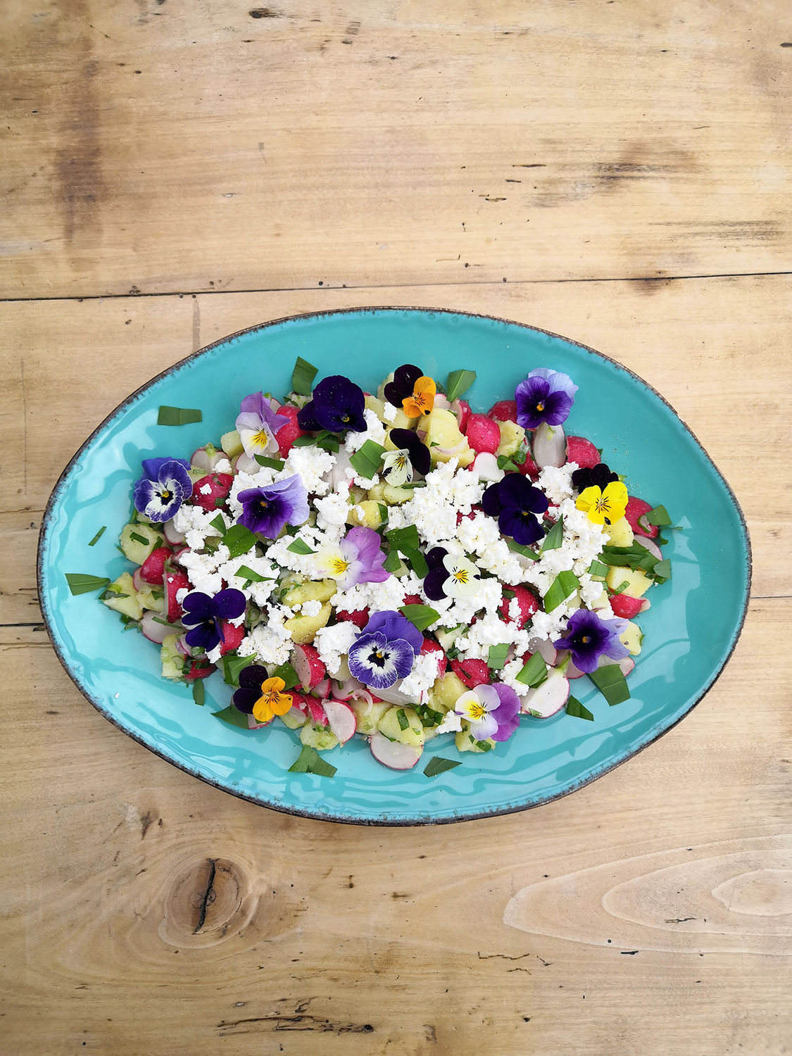 - Dans un plat ou sur une assiette, dresser la salade de pommes de terre et de radis. Ajouter délicatement l’émietté de fromage par-dessus.