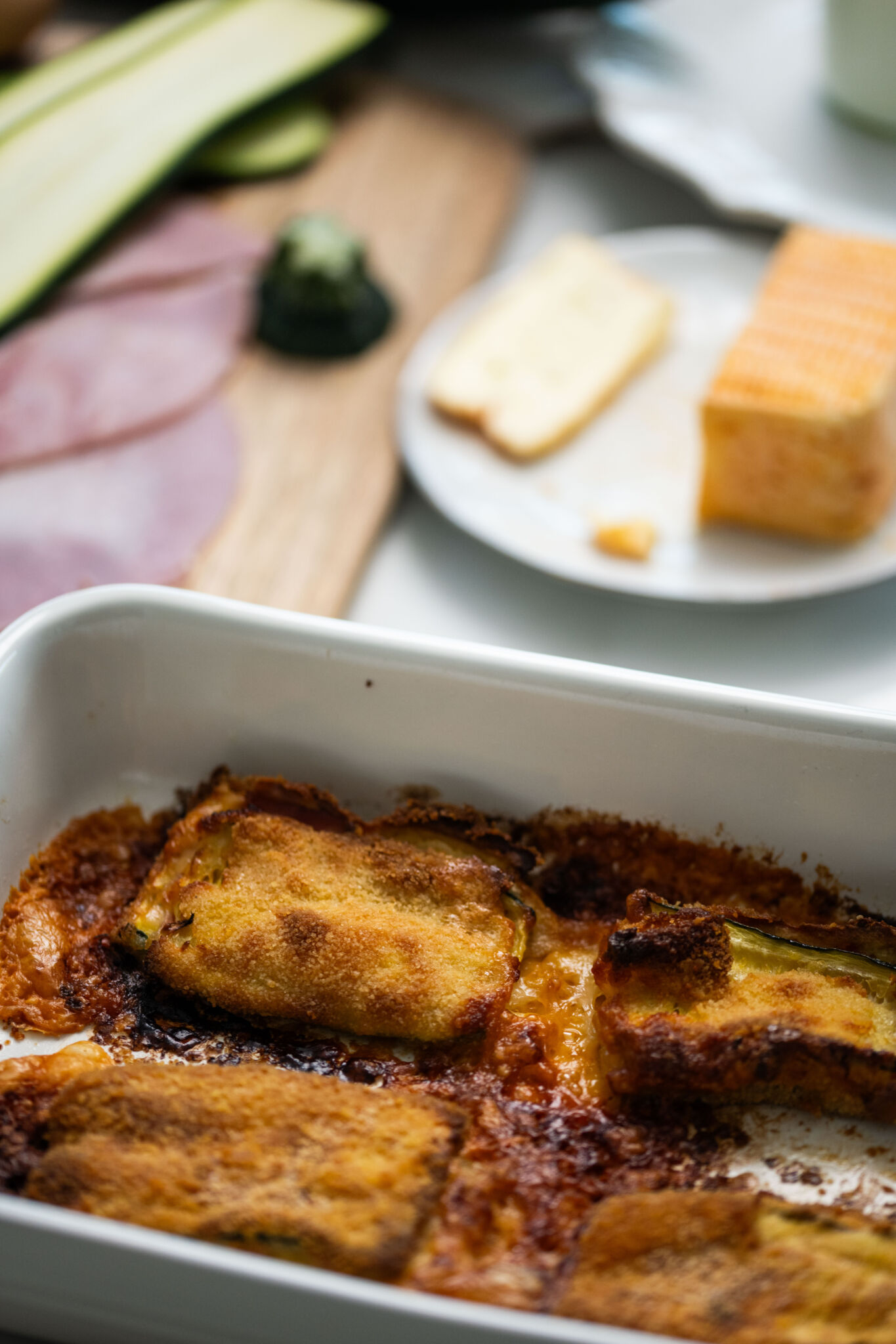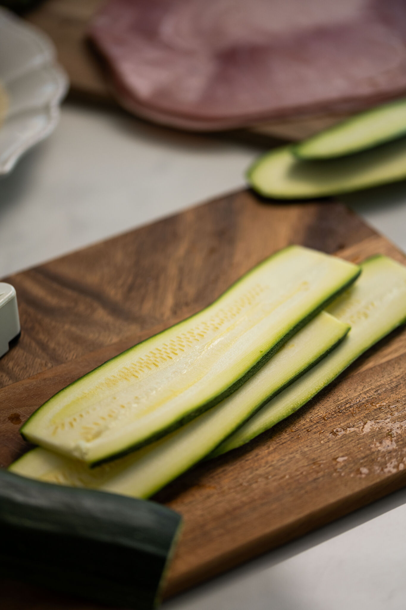 3. Assembler les bouchées : Sur une tranche de courgette, dépose une demi-tranche de jambon et un morceau de fromage de Herve. Recouvre avec une autre tranche de courgette pour former un petit « sandwich ».