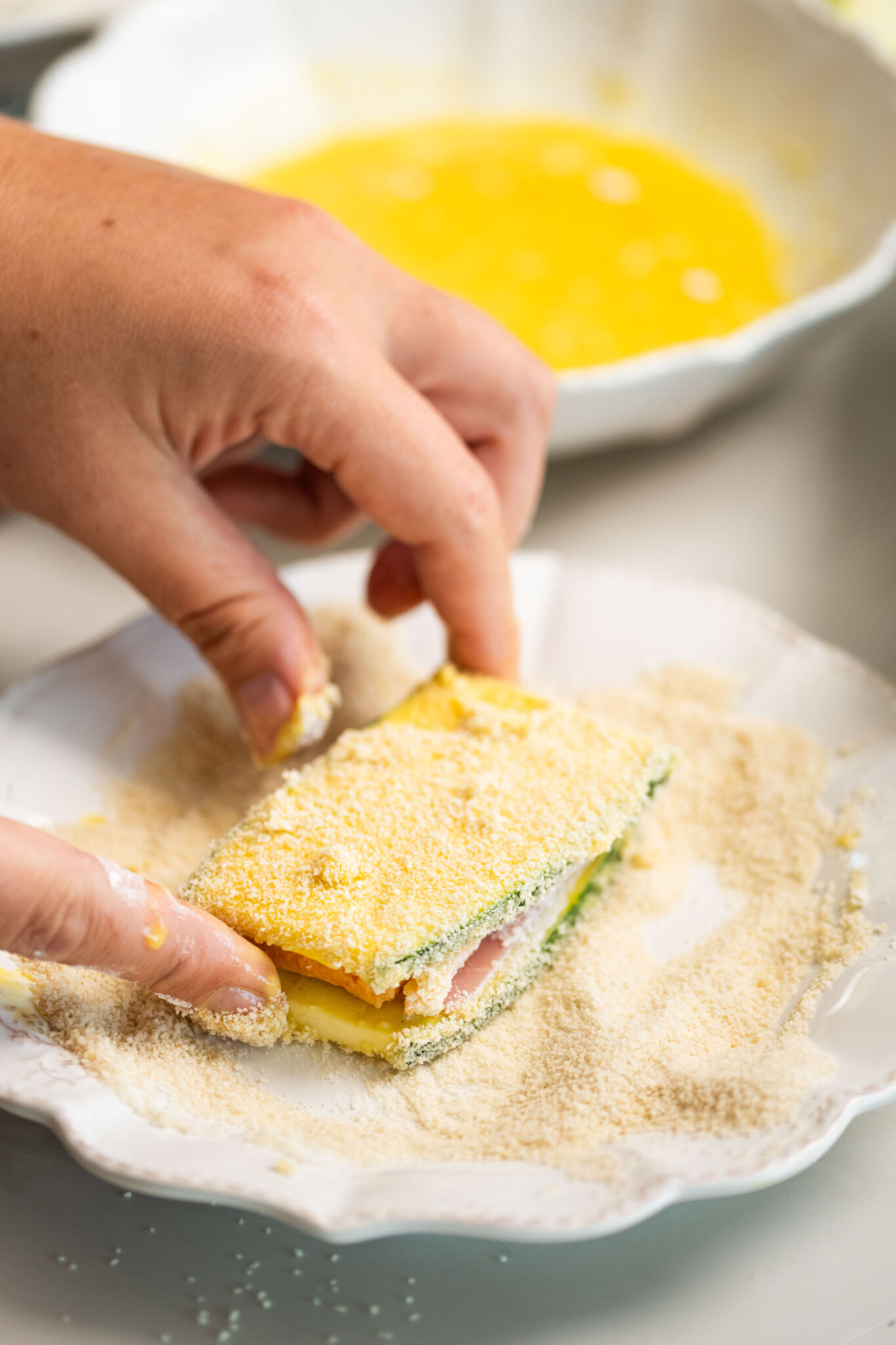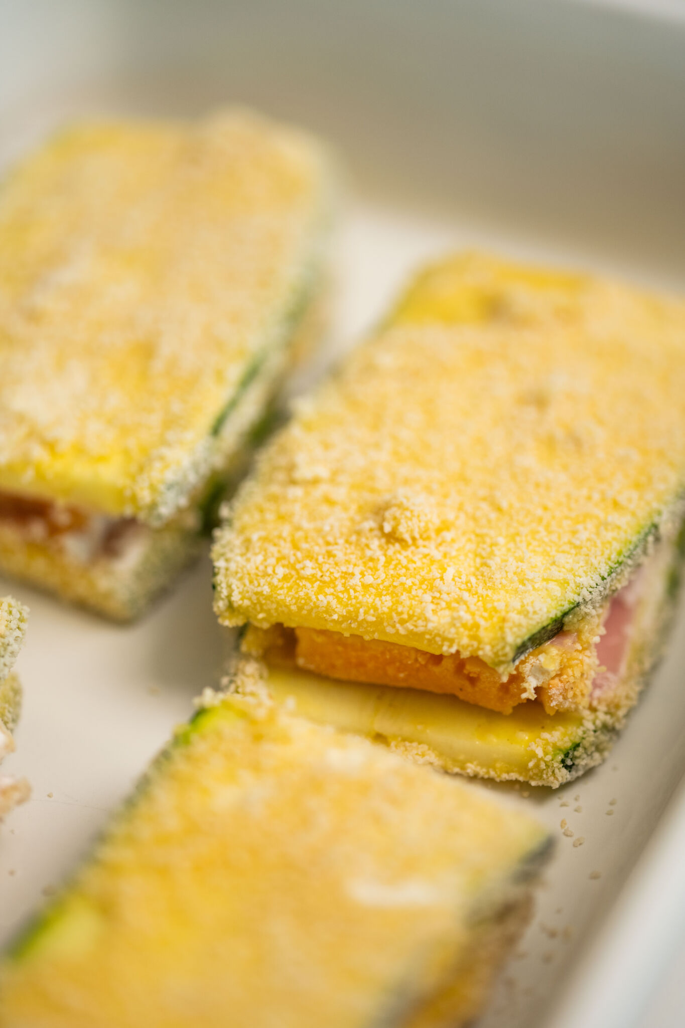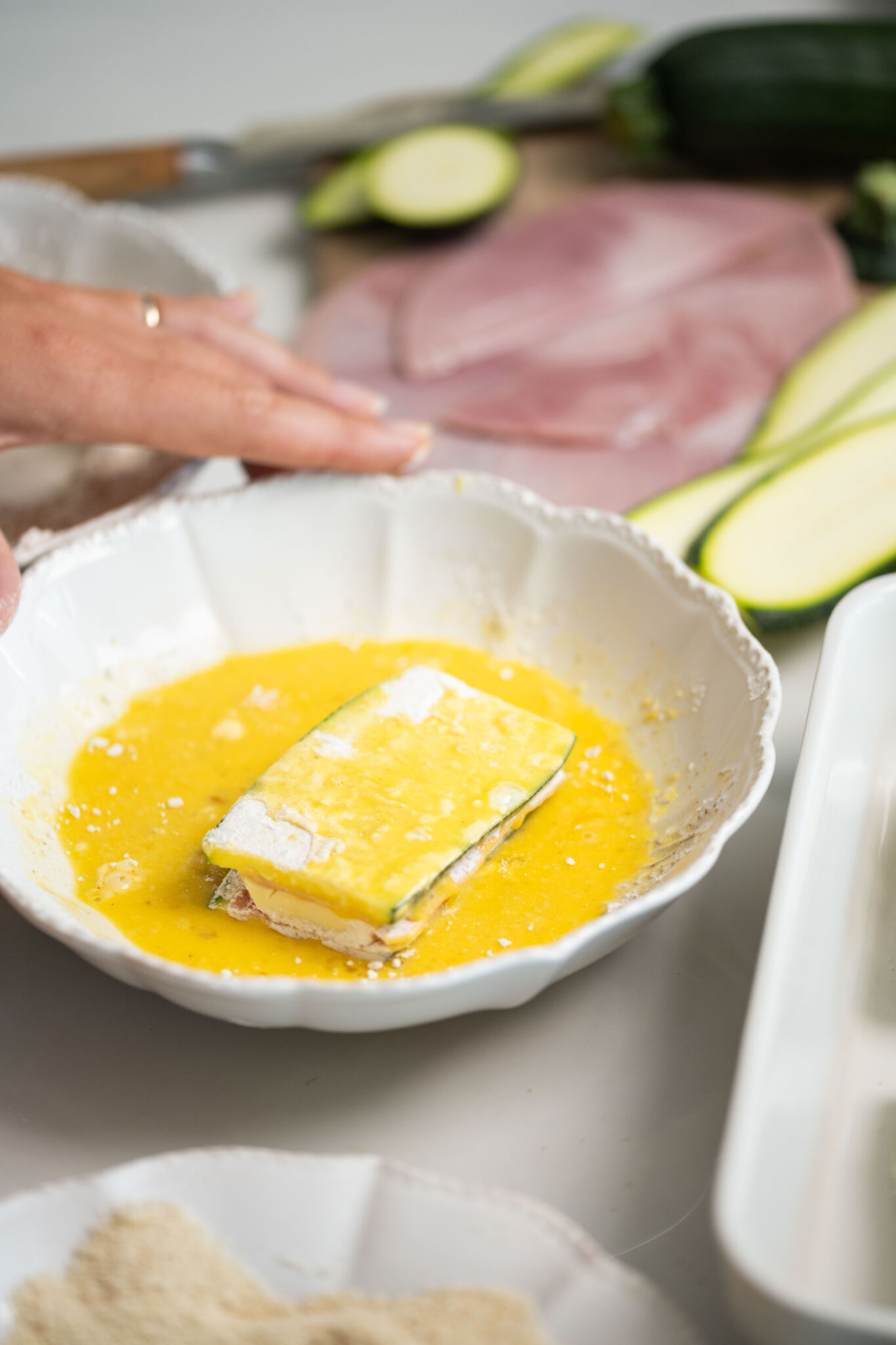 4. Paner les courgettes : Passe chaque bouchée successivement dans la farine, puis dans le mélange œuf-lait, et enfin dans la chapelure.