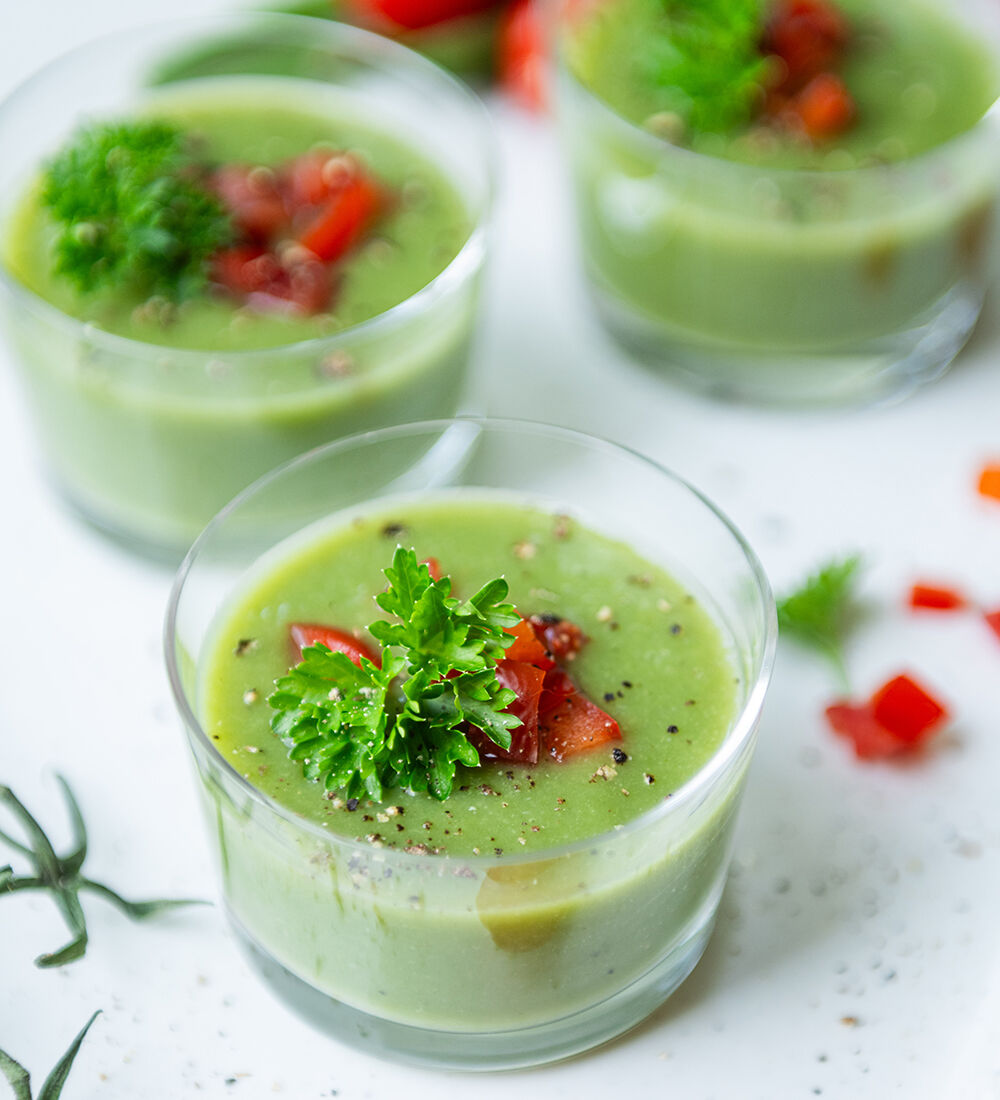 6. Réservez au frais jusqu’au service. Servez bien frais décorés avec la brunoise et les feuilles de persil.