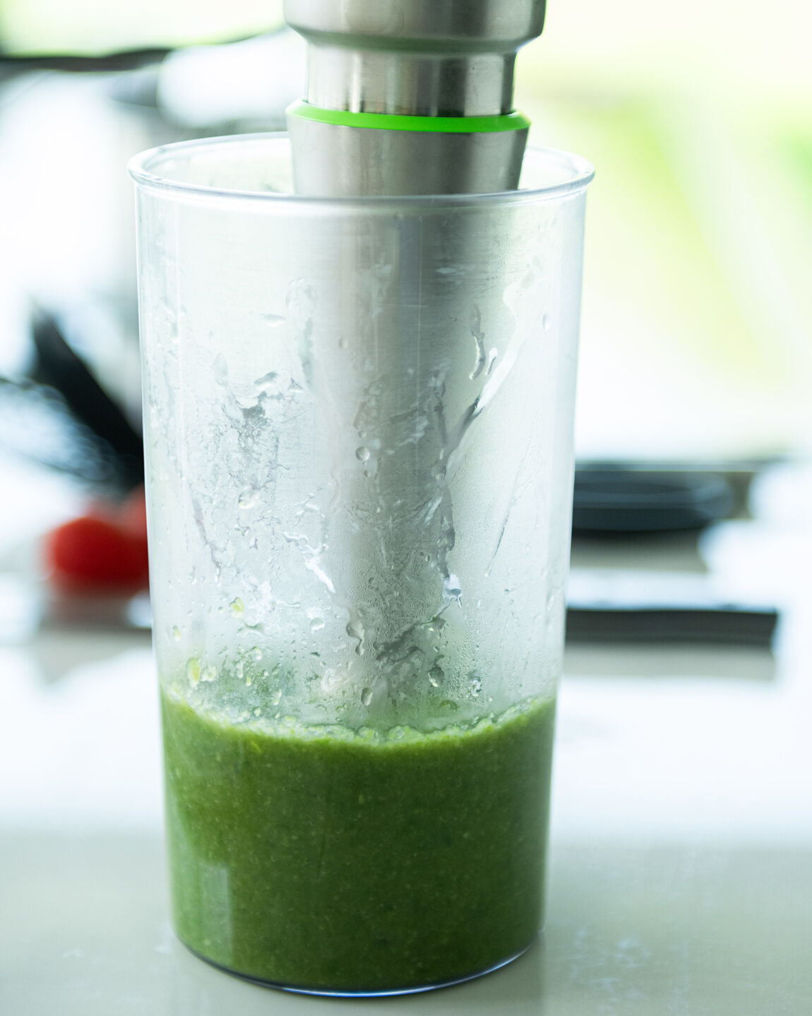 4. Mixez-les dans un blender, en ajoutant un peu d’eau de cuisson jusqu’à obtenir la consistance de gaspacho souhaitée