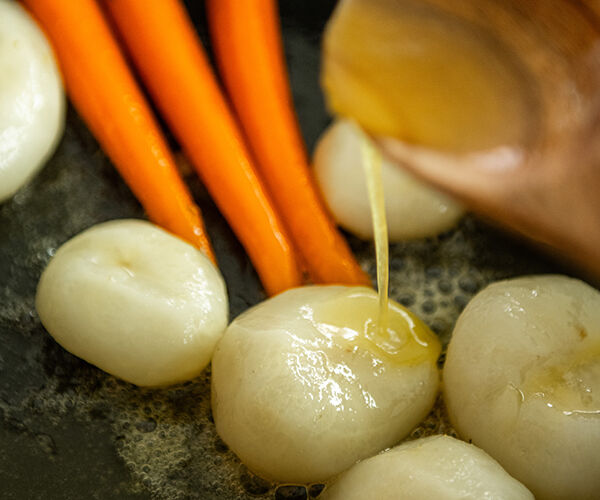 2. Dans une sauteuse, faire mousser le beurre. Ajouter les navets et les carottes sur feu modéré.