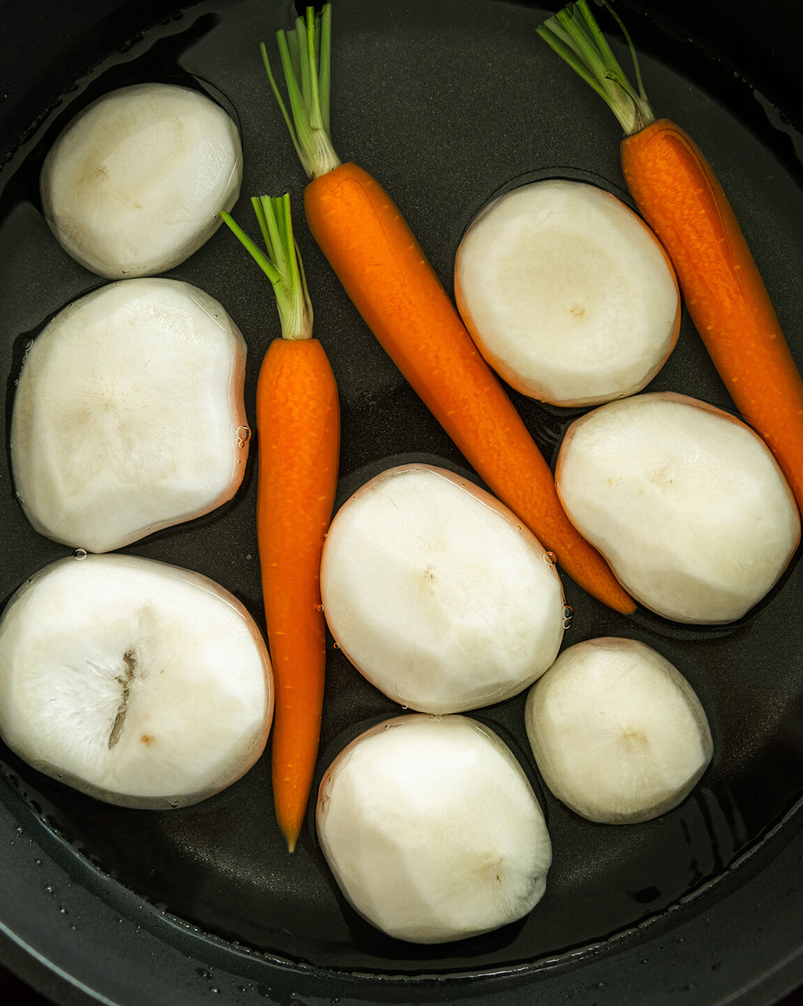 1. Cuire les carottes et les navets dans un fond d’eau avec couvercle fermé pendant 10 minutes.