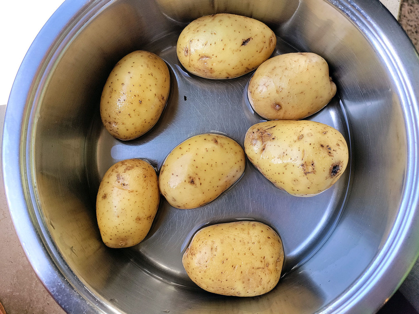 • (1) Laver, frotter les pommes de terre et les cuire à l’eau avec la peau.