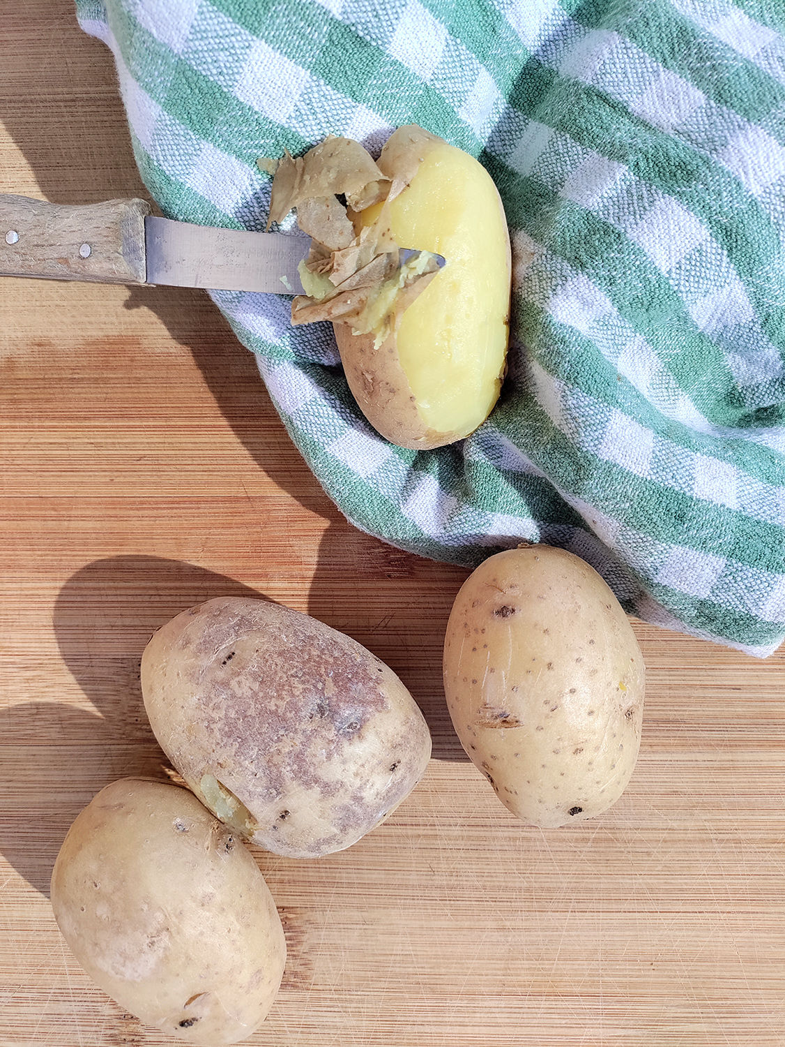 Une fois bien cuites, égoutter et passer les pommes de terre sous l’eau froide pour pouvoir les tenir en main ou vous aider d’un tissu afin de les éplucher.