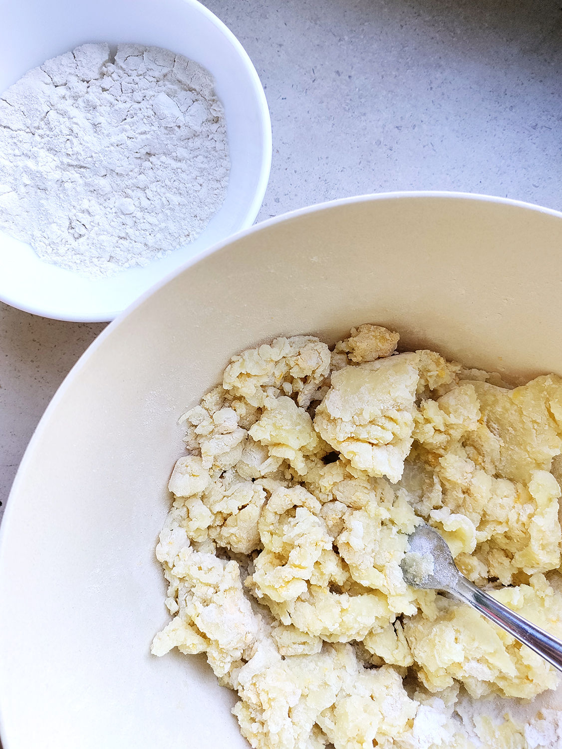 • (5) Incorporer la farine d’abord à la fourchette, ensuite à la main pour obtenir une boule non collante. Eviter de trop travailler la pâte car cela la rendra d’autant plus collante et élastique.
