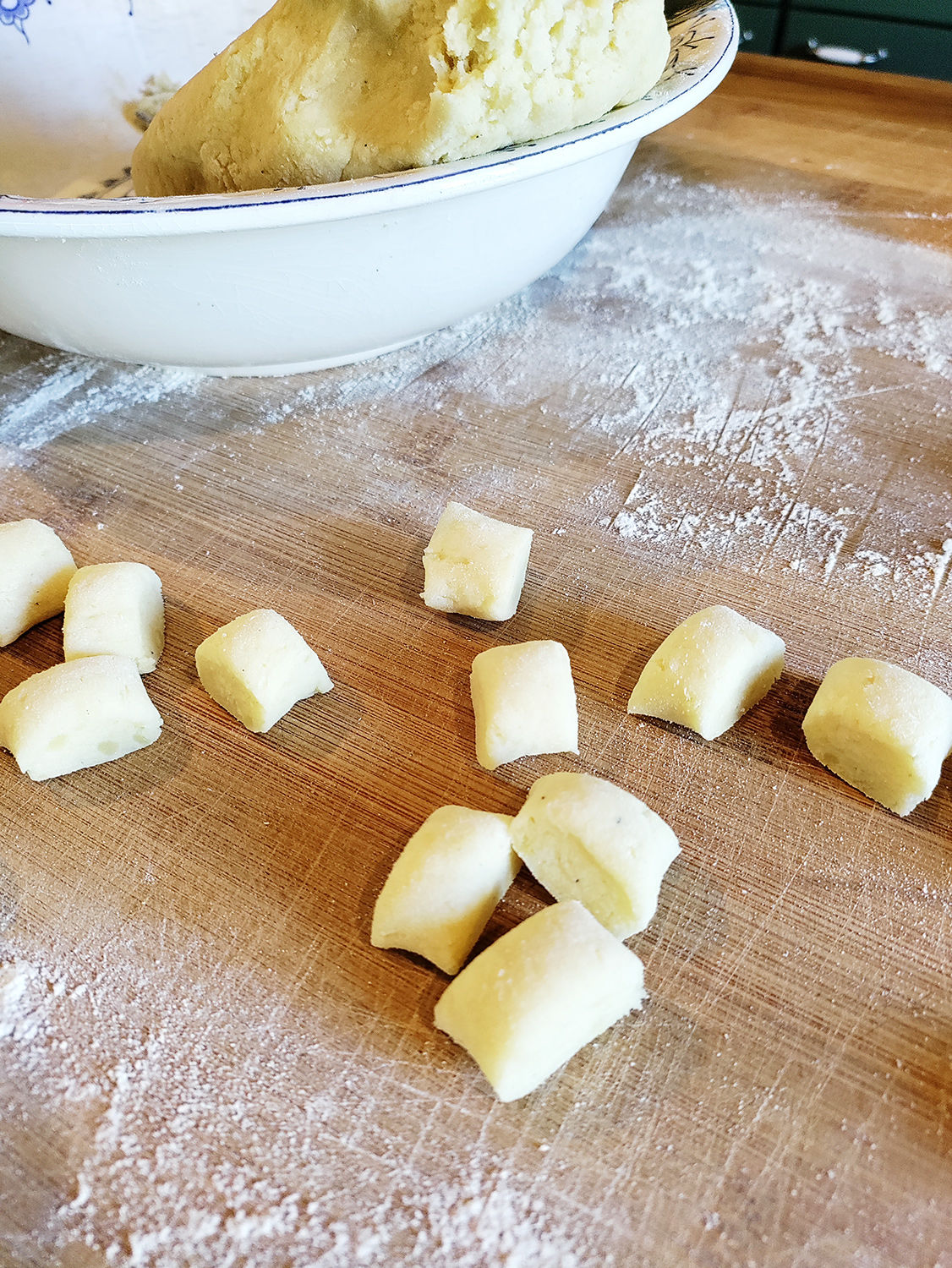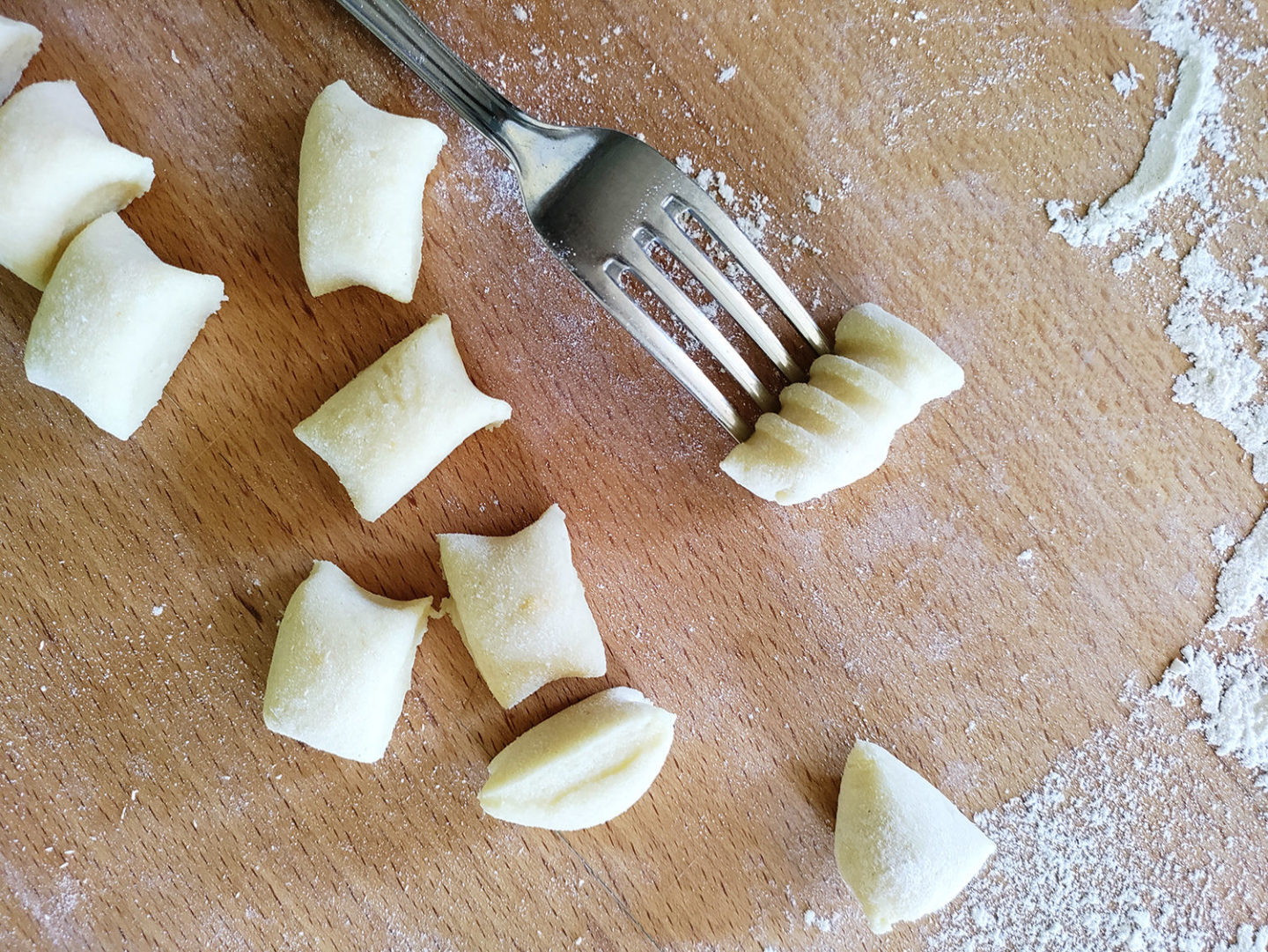 Pour les plus motivés ou les puristes, il est possible de donner aux gnocchis une forme plus traditionnelle à l’aide du dos d’une fourchette. Nous avons décidé de gagner du temps, de l’énergie et de la patience en gardant une forme de berlingot plus « artisanale ».