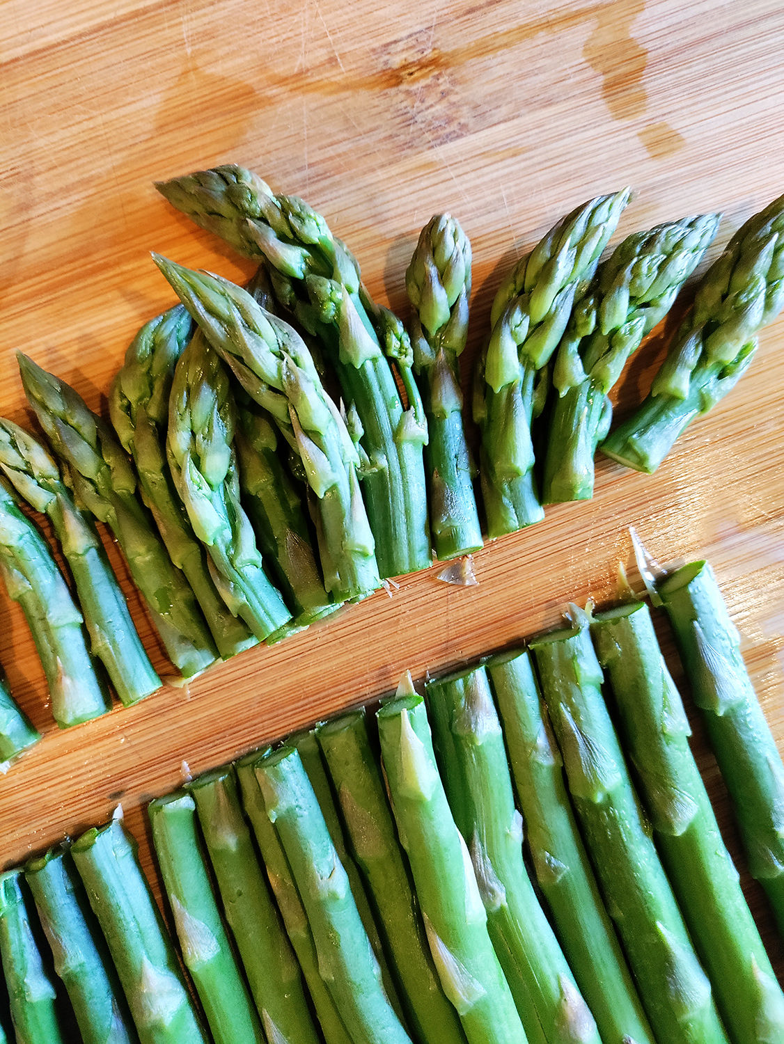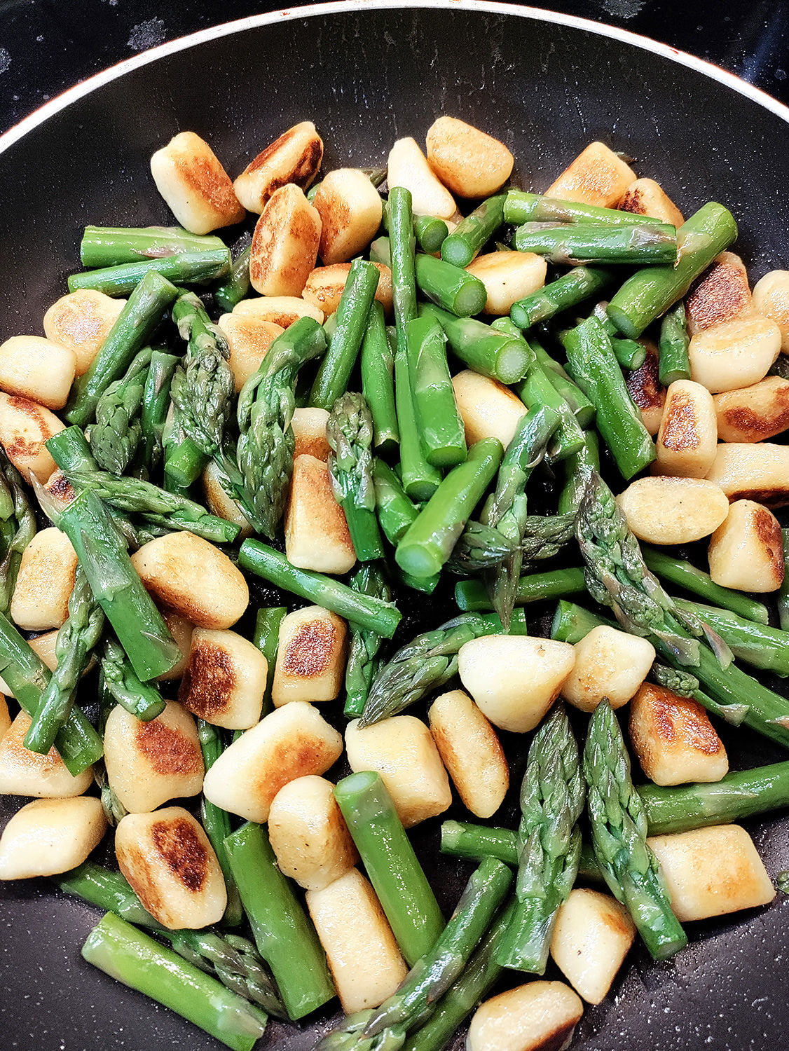 • (12) Couper les pointes des asperges et le reste en tronçons. Ajouter les tronçons dans la poêle avec les gnocchis à feu doux. Réserver les pointes car elles sont plus délicates et seront réchauffées en dernière minute.