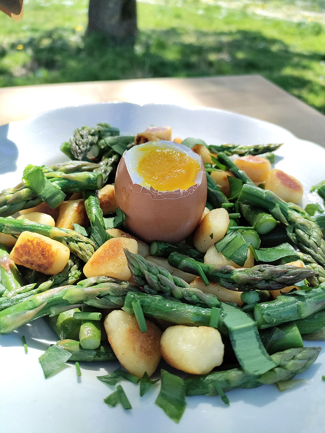 • (15) Dresser les gnocchis et les asperges dans une assiette profonde, ajouter l’œuf dans sa coquille ou écalé.
