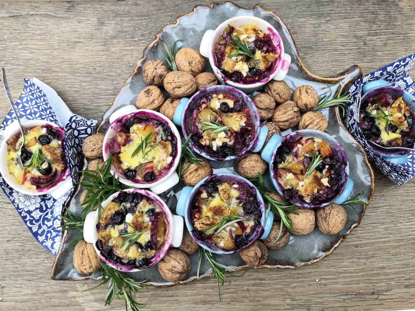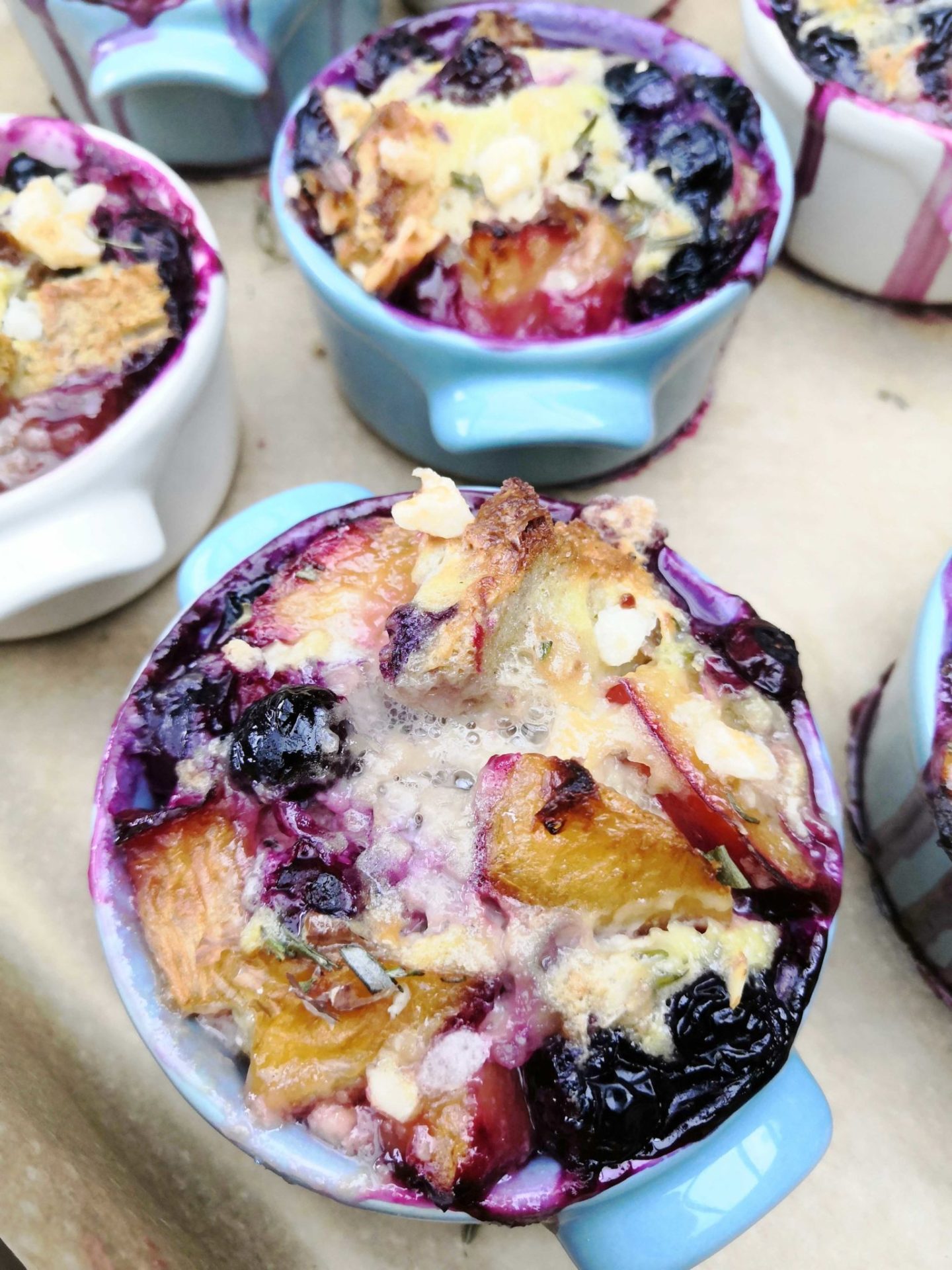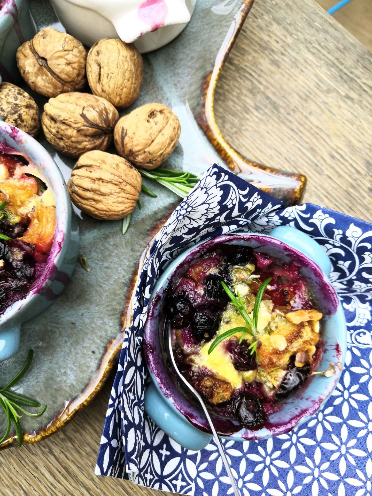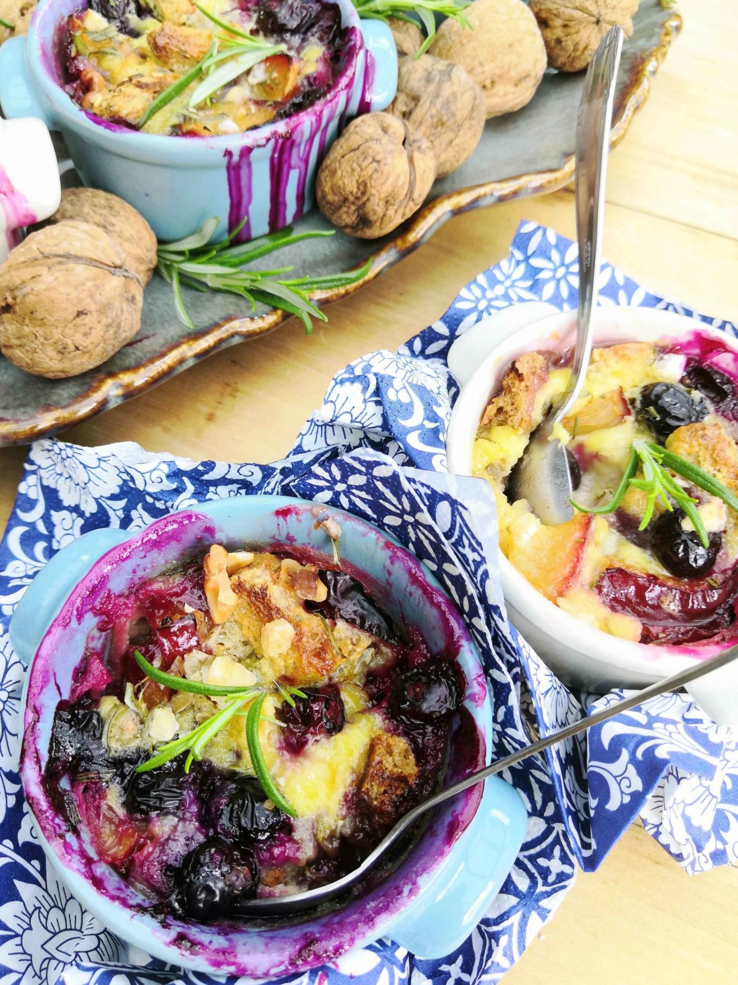6. Dans des ramequins, disposer le pain, les prunes, les myrtilles, les noix et le romarin. Ajouter un peu de sucre perlé et arroser à ¾ de la préparation œufs/sucre/crème.