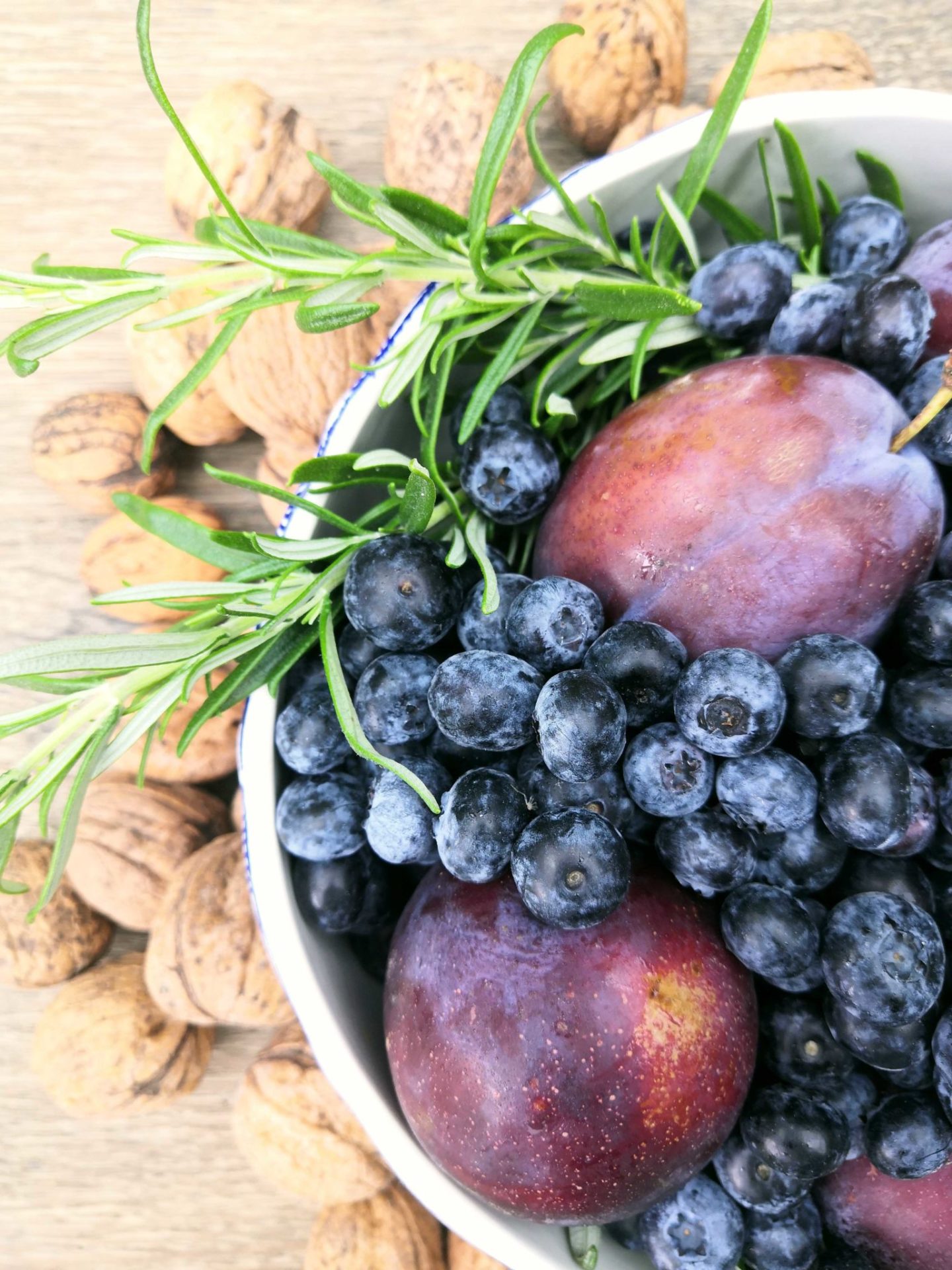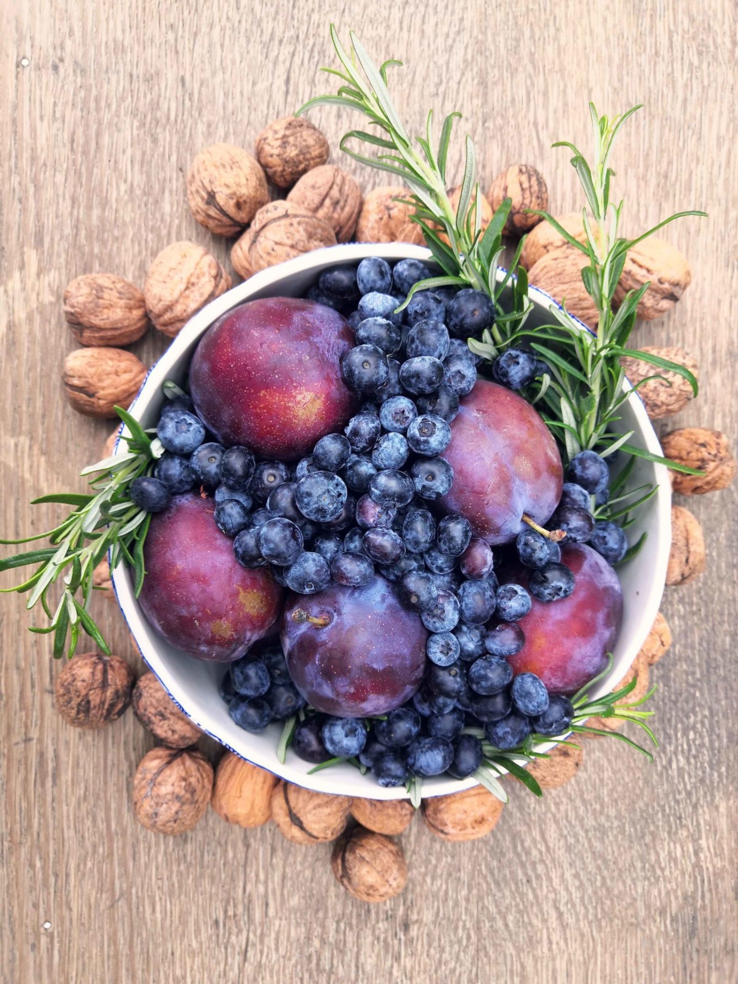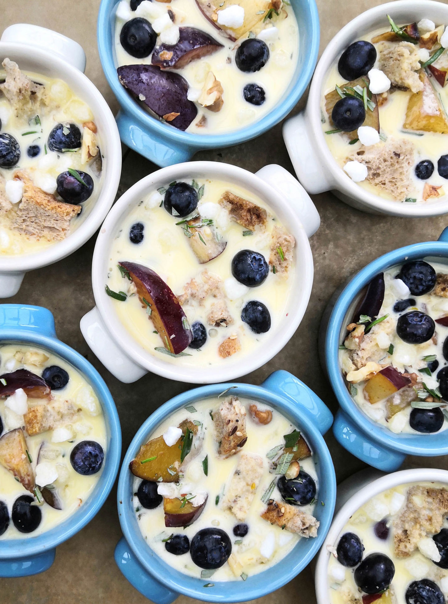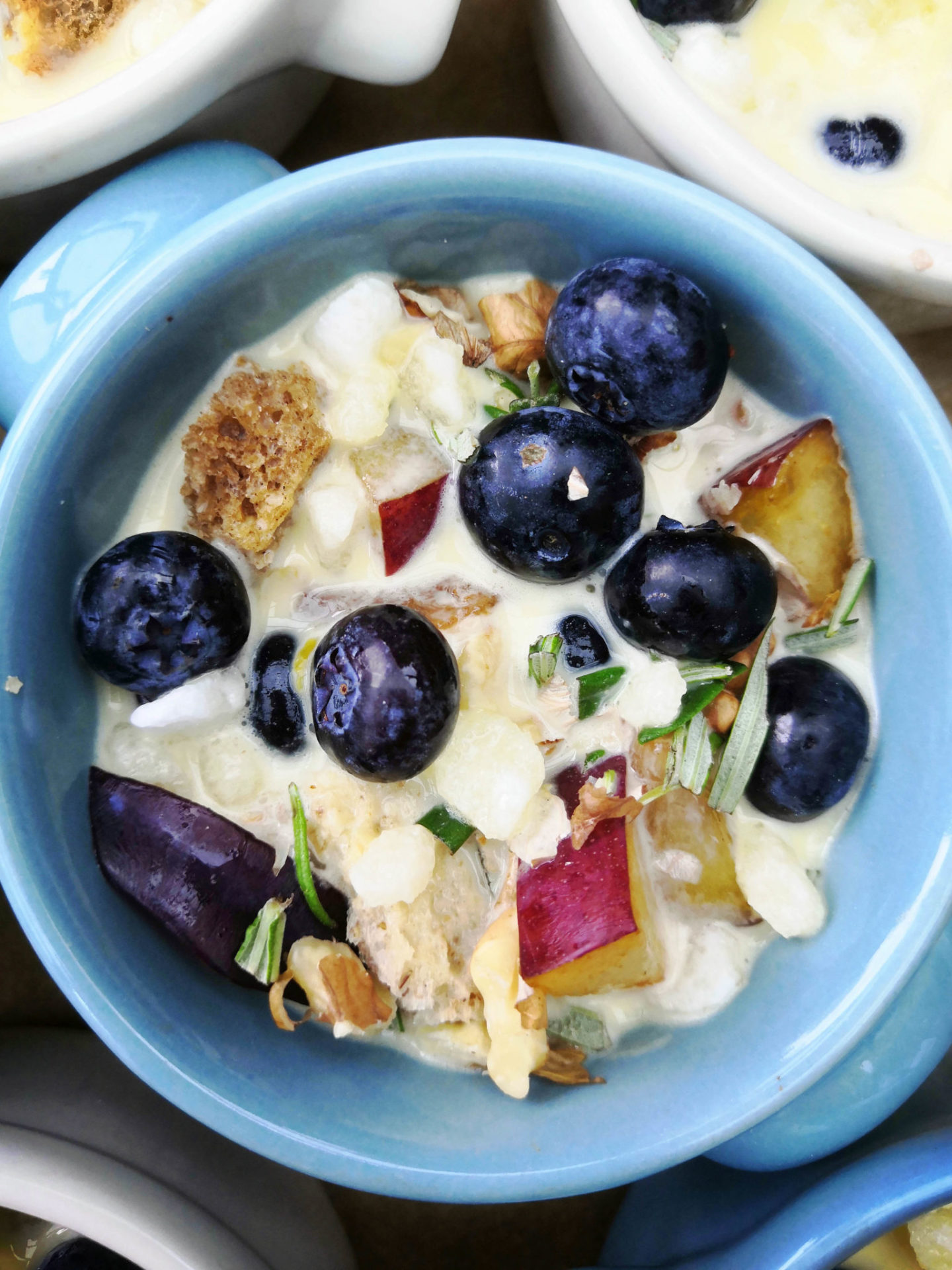 6. Dans des ramequins, disposer le pain, les prunes, les myrtilles, les noix et le romarin. Ajouter un peu de sucre perlé et arroser à ¾ de la préparation œufs/sucre/crème.