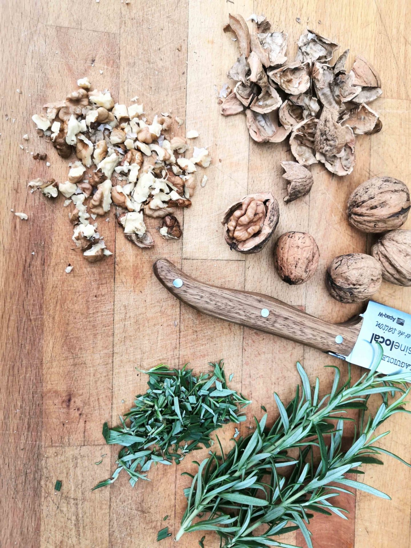 5. Hacher grossièrement les noix et le romarin. Garder quelques feuilles de romarin pour la décoration.