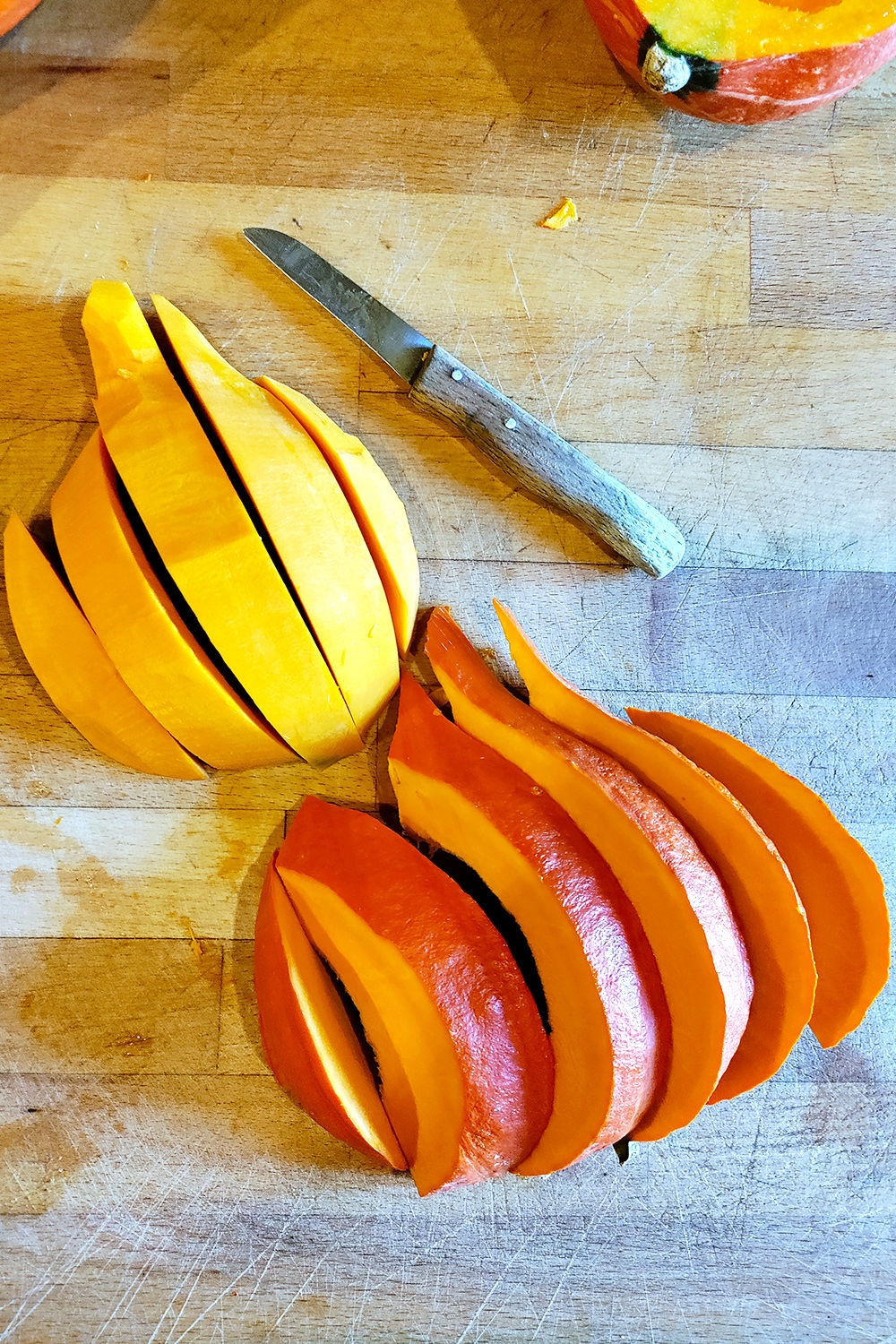 3. L’épluchage du potimarron est facultative : si la peau n’est pas trop dure, vous pouvez simplement le laver avec sa découpe