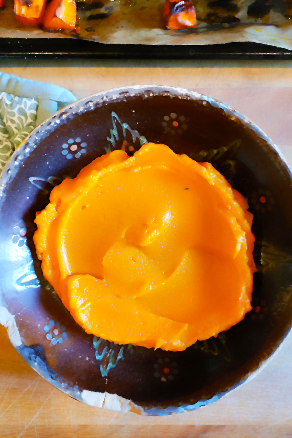 10. Préparer la purée avec le potimarron et patate douce cuits à la vapeur : passer les au presse-purée, rajouter une noix de beurre et un peu de crème (facultatif), saler et poivrer