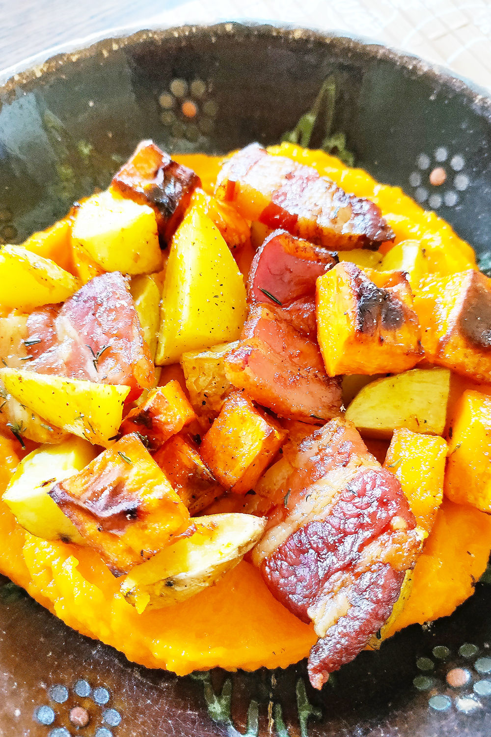 11. Servir la purée surmontée du mélange potimarron, pommes de terre et lard