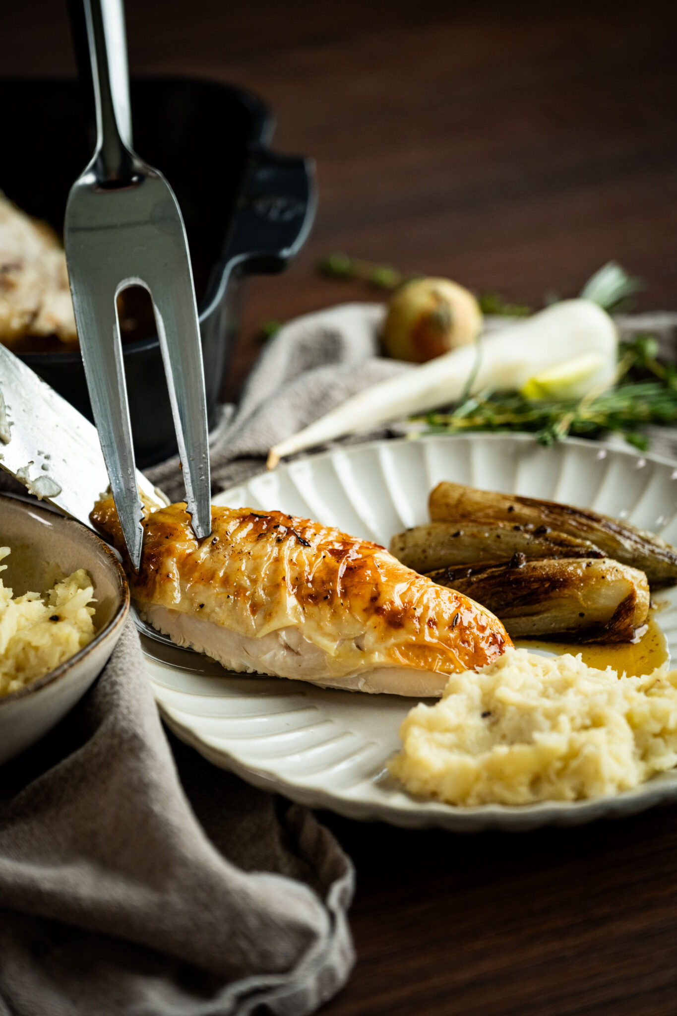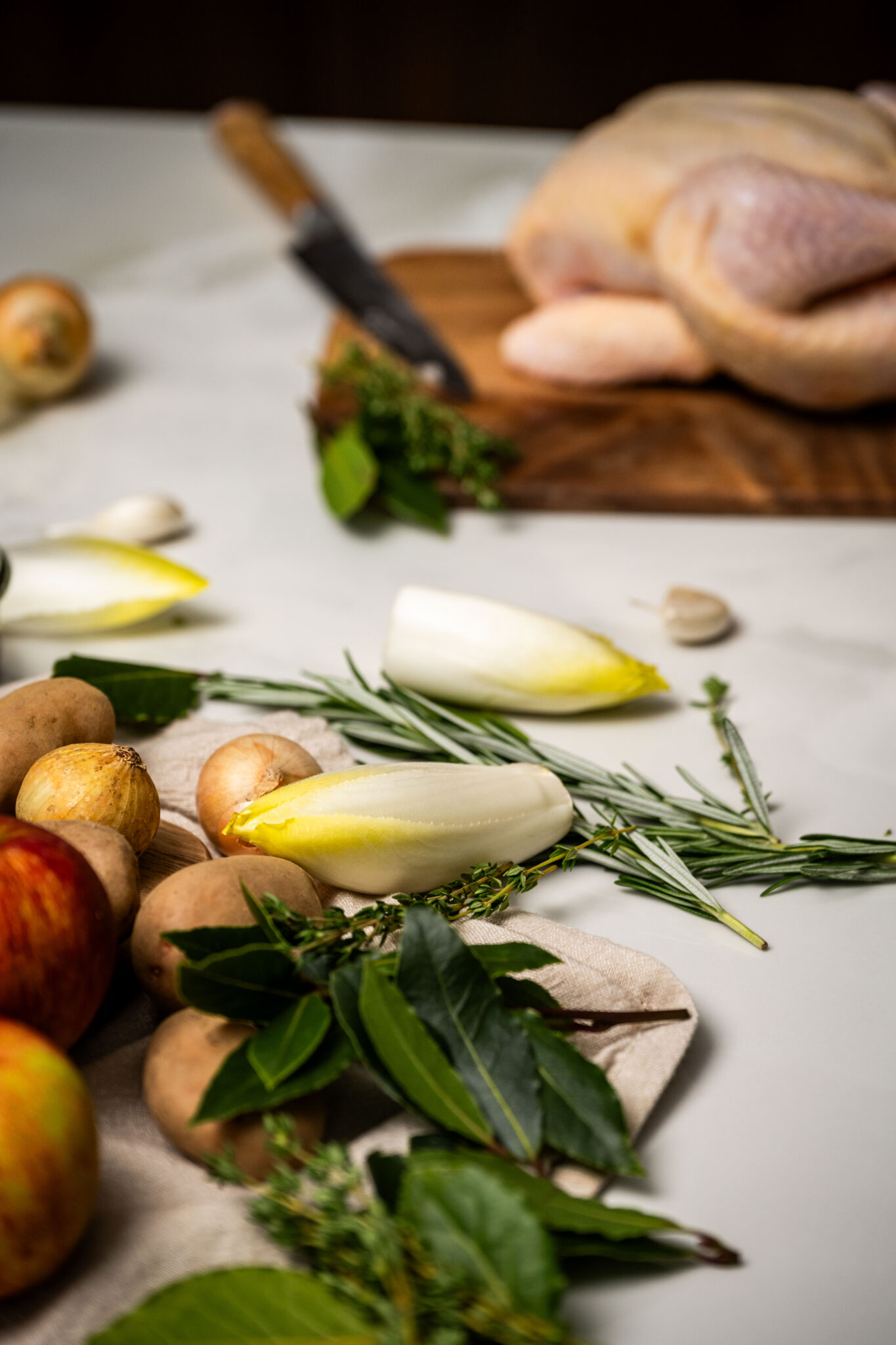 Quand on choisit un poulet de chez nous, élevé en plein air (voire bio), on mise sur une viande qui a du goût et qui supporte la cuisson au four sans tricher. C’est exactement ce qu’il faut pour cette recette généreuse : un poulet rôti parfumé aux pommes et au sirop de Liège, servi avec une purée de panais ultra douce et des chicons braisés légèrement caramélisés. Un plat complet, de saison, et franchement efficace pour mettre tout le monde d’accord.