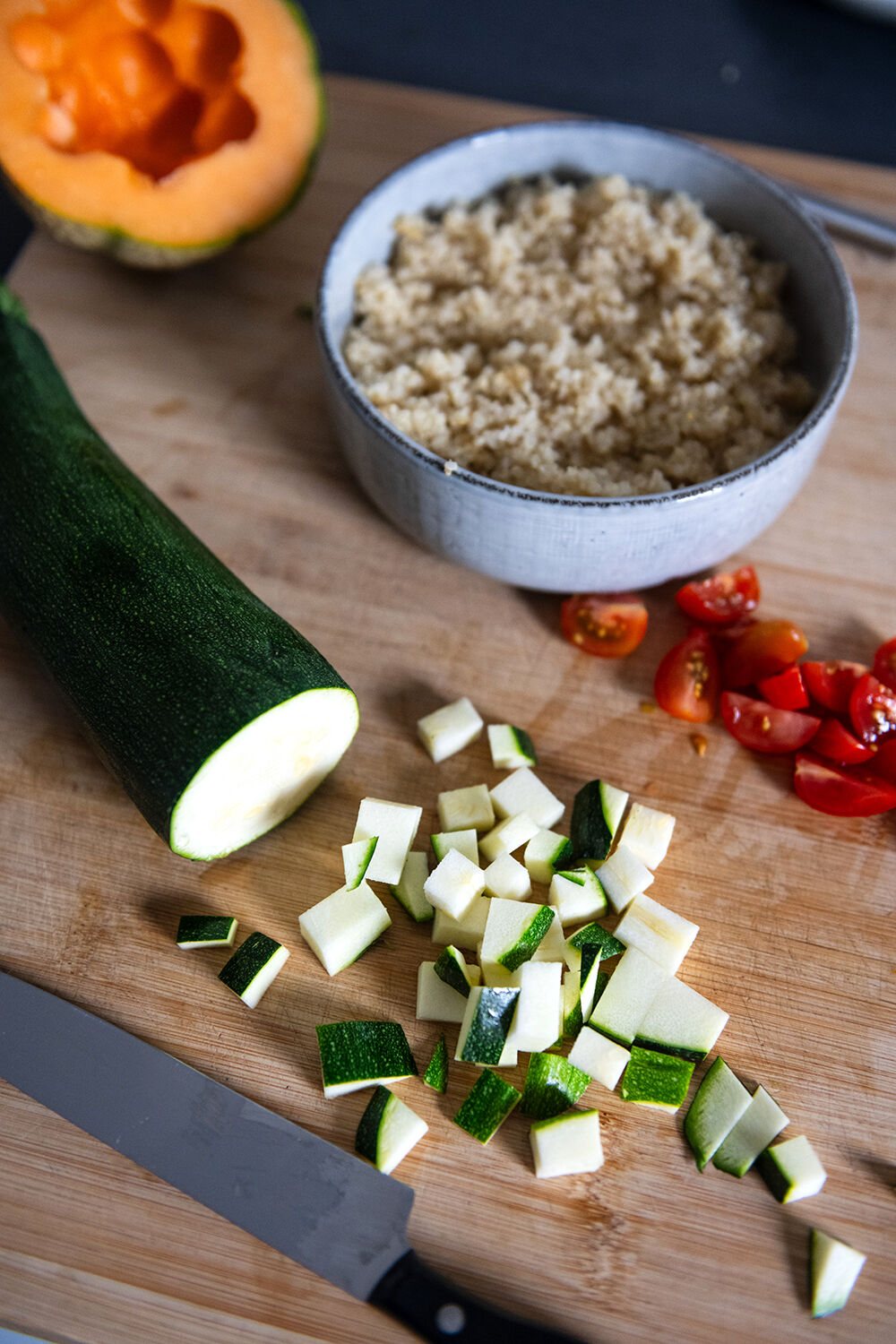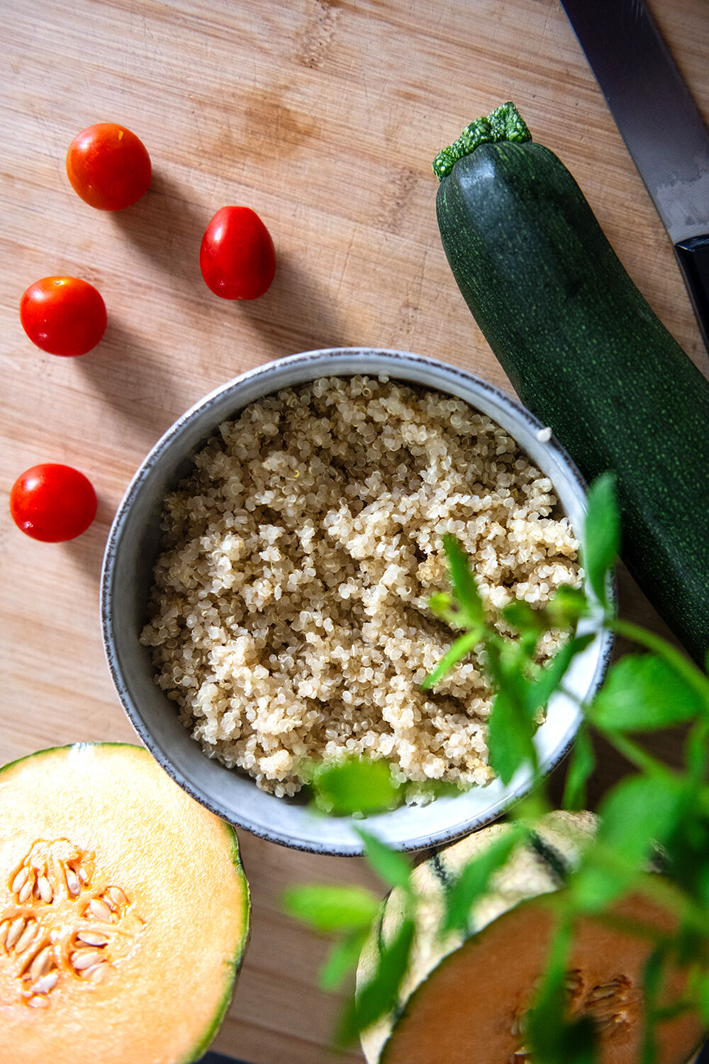 5. Dans un grand saladier, déposer le quinoa. Ajouter les tomates, les cubes de courgette et les billes de melon. Parsemer de menthe ciselée. Mélanger tous les ingrédients.