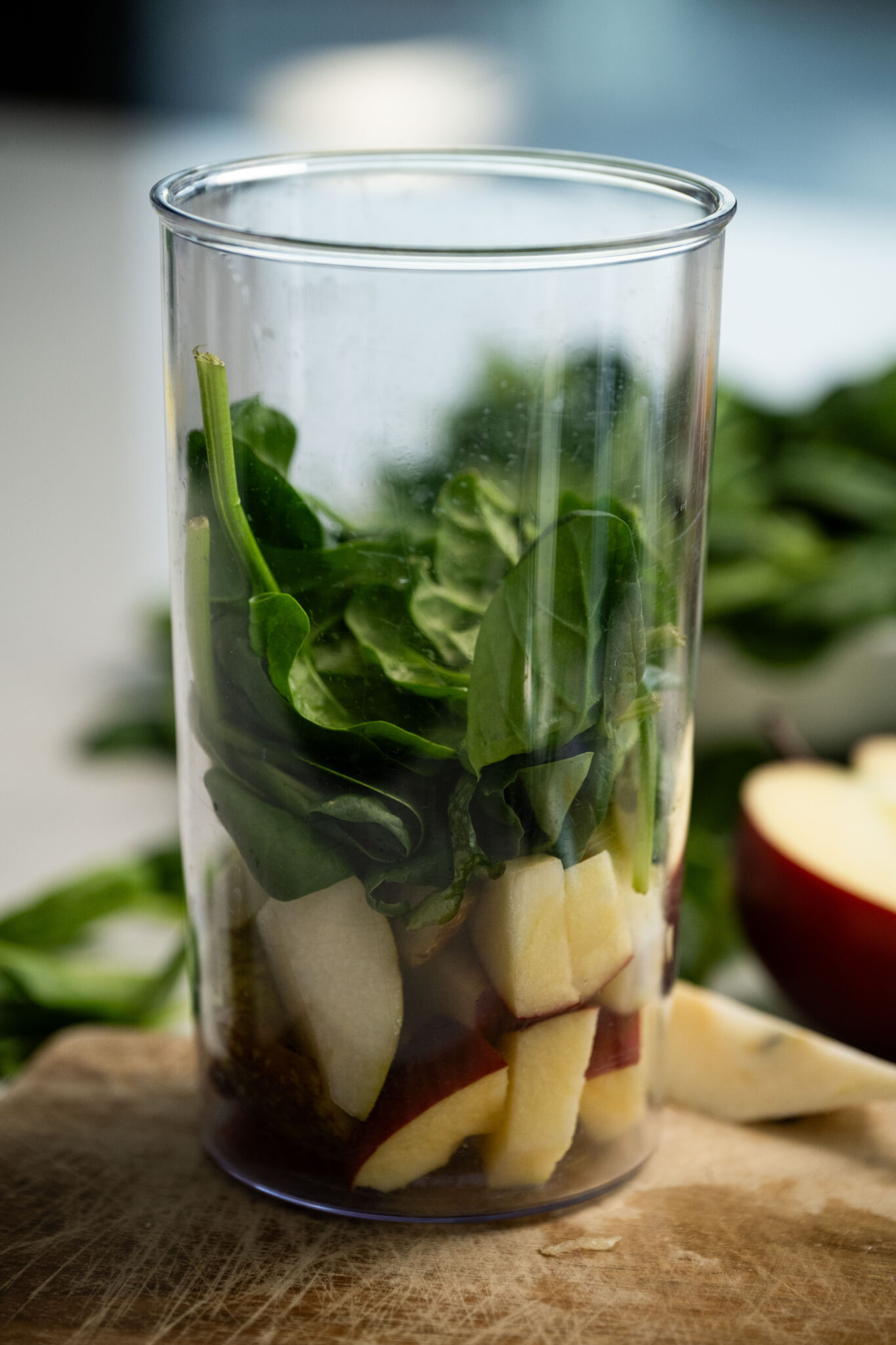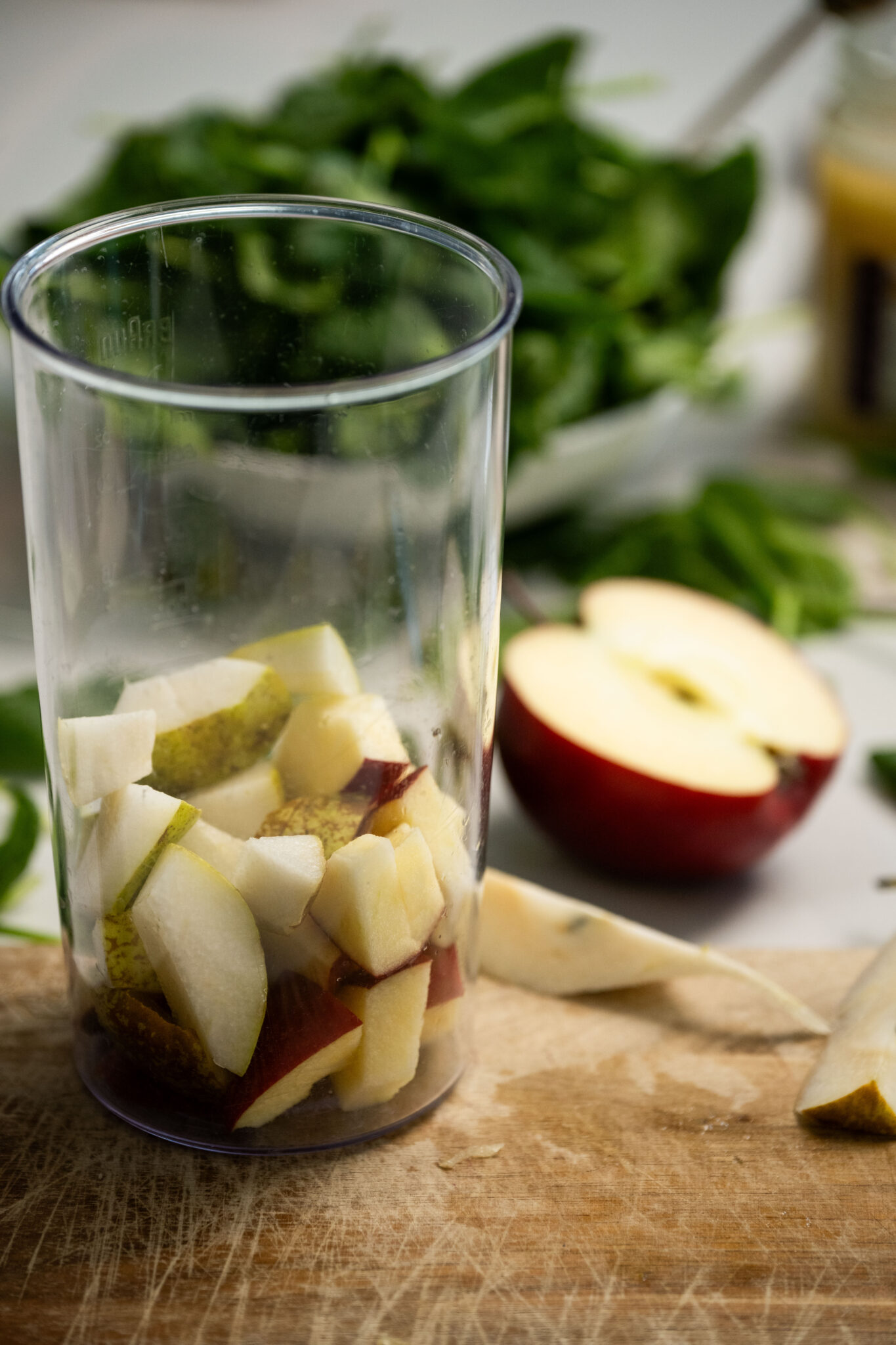 - Lave bien les épinards et coupe les fruits en morceaux.