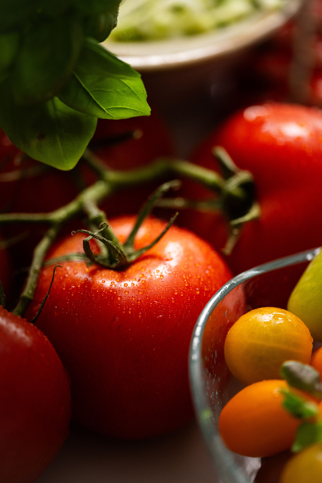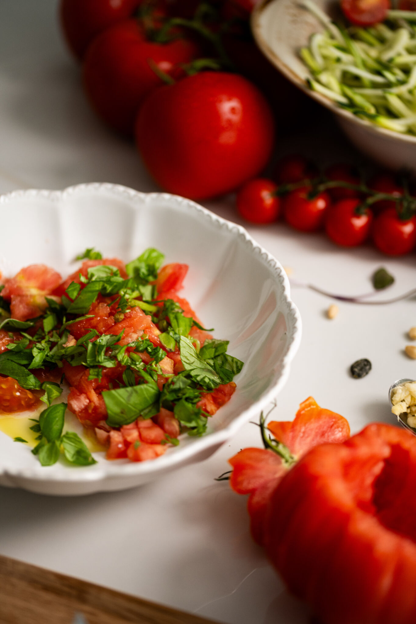 • Evidez les tomates, ciselez le basilic et pressez la gousse d’ail.