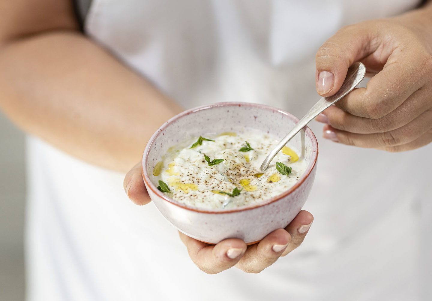 5. Presser le concombre pour enlever le plus d’eau possible, et l’ajouter au yaourt.