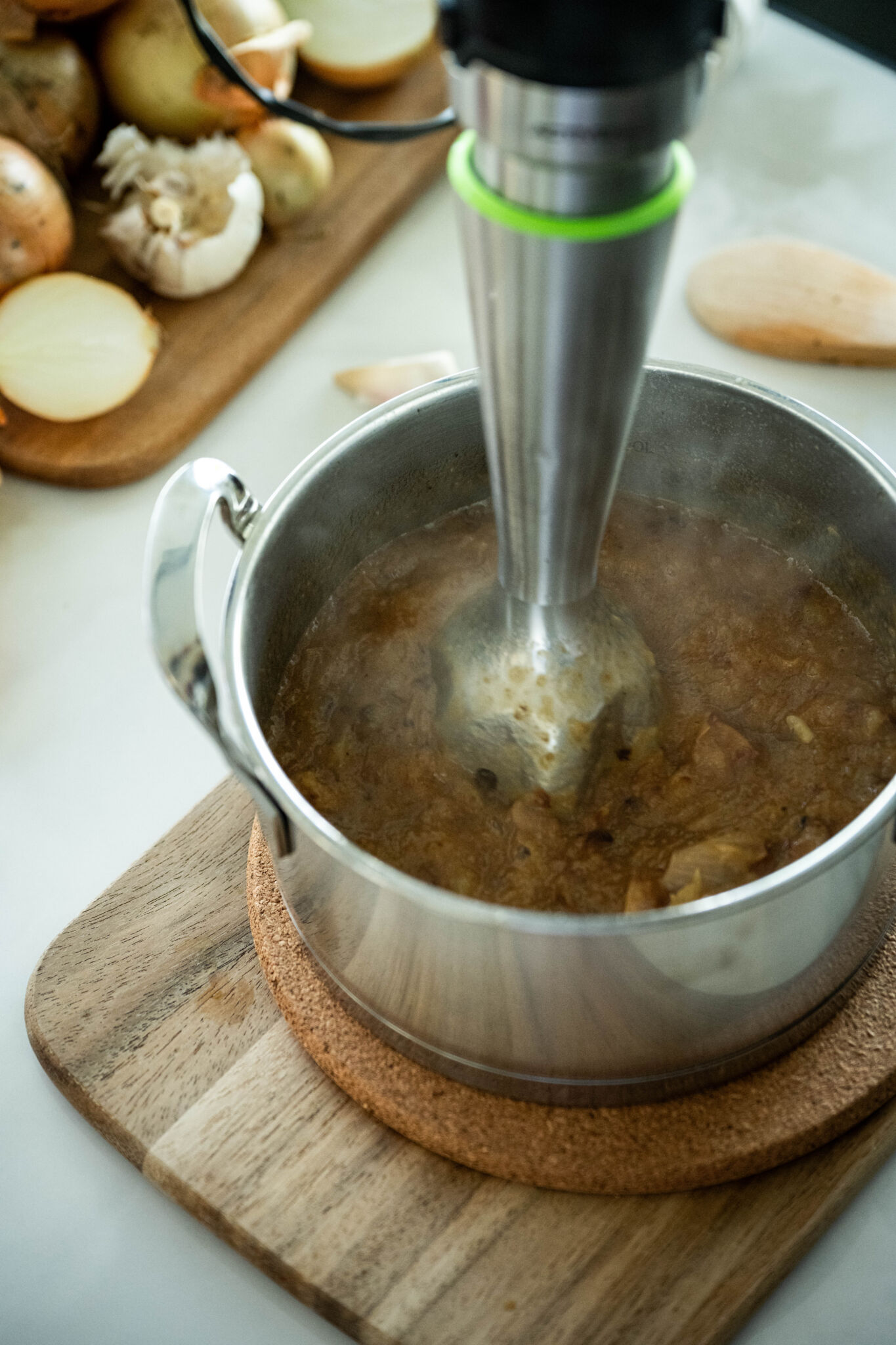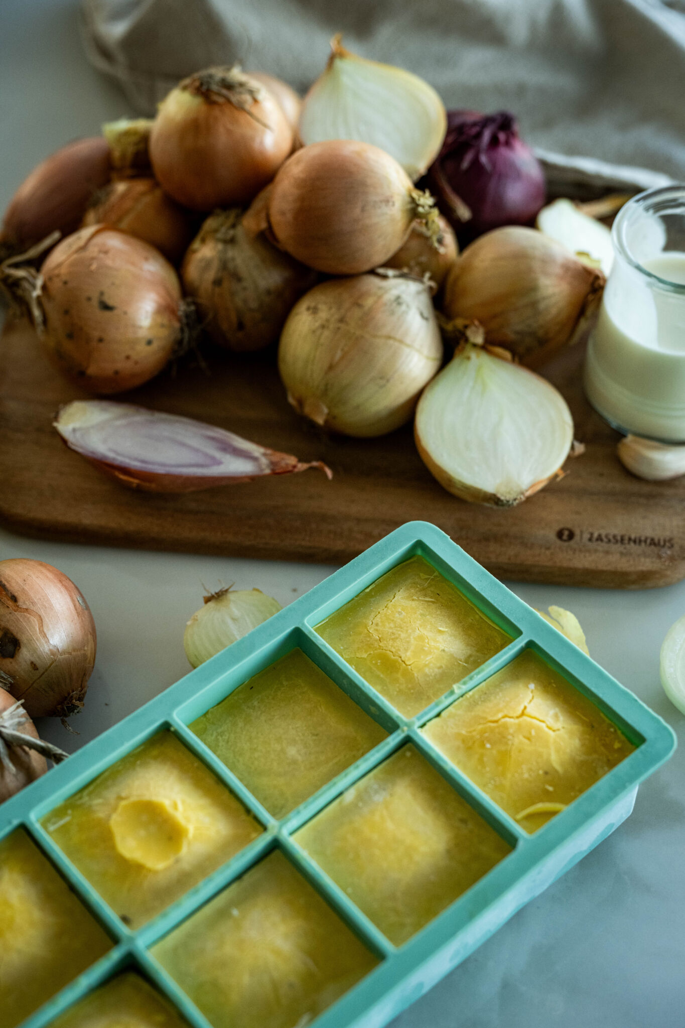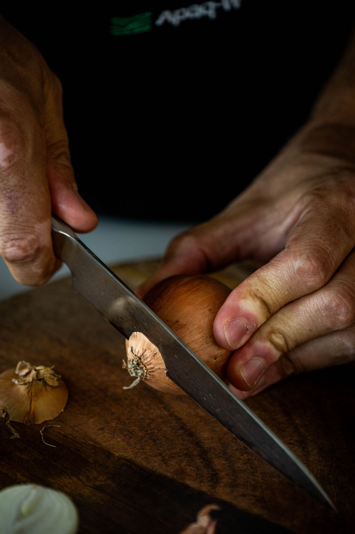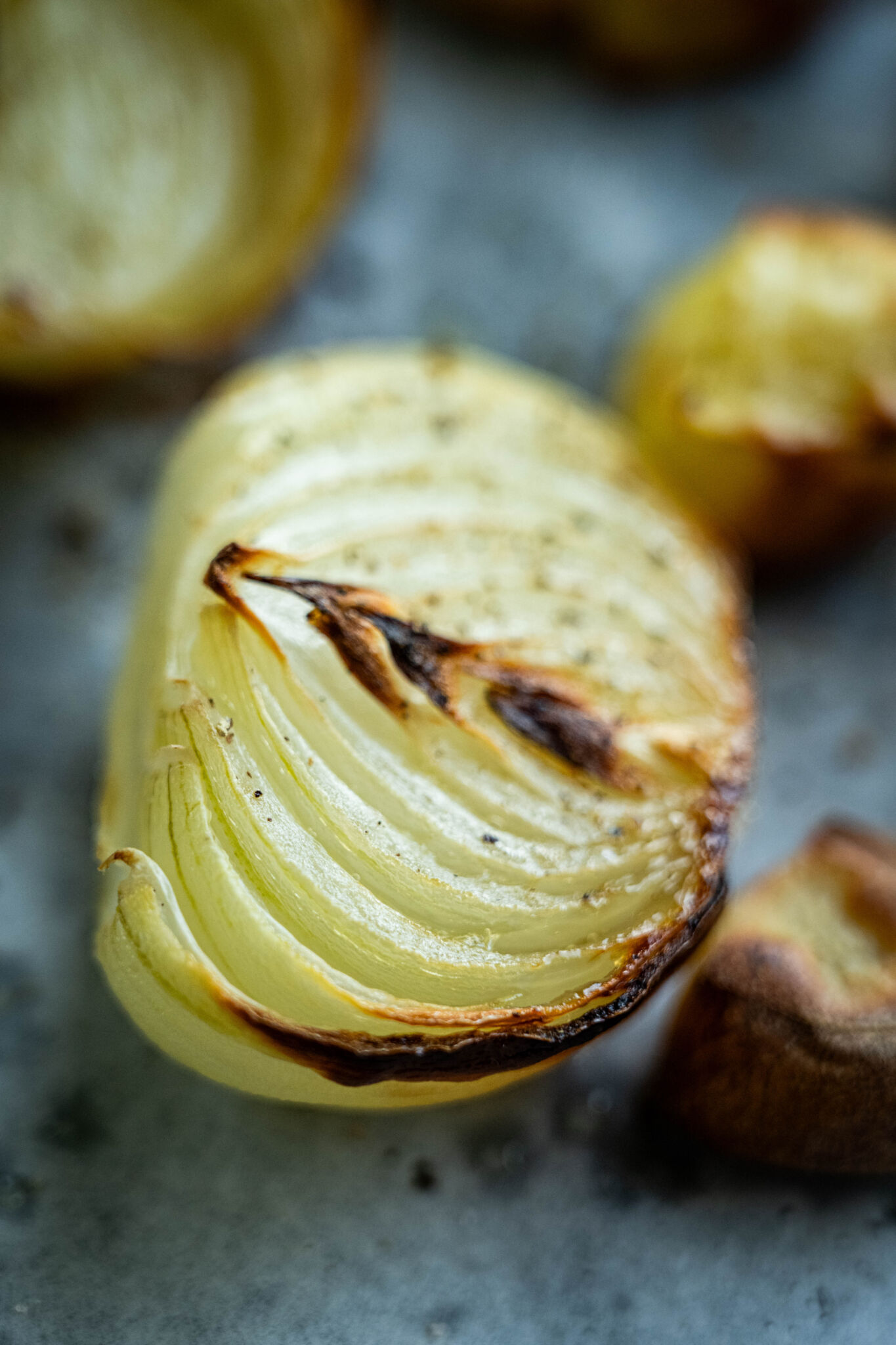 - 6 oignons jaunes moyens, pelés et coupés en quartiers