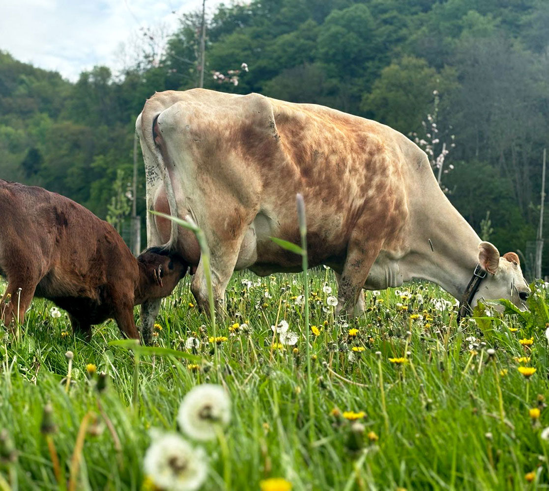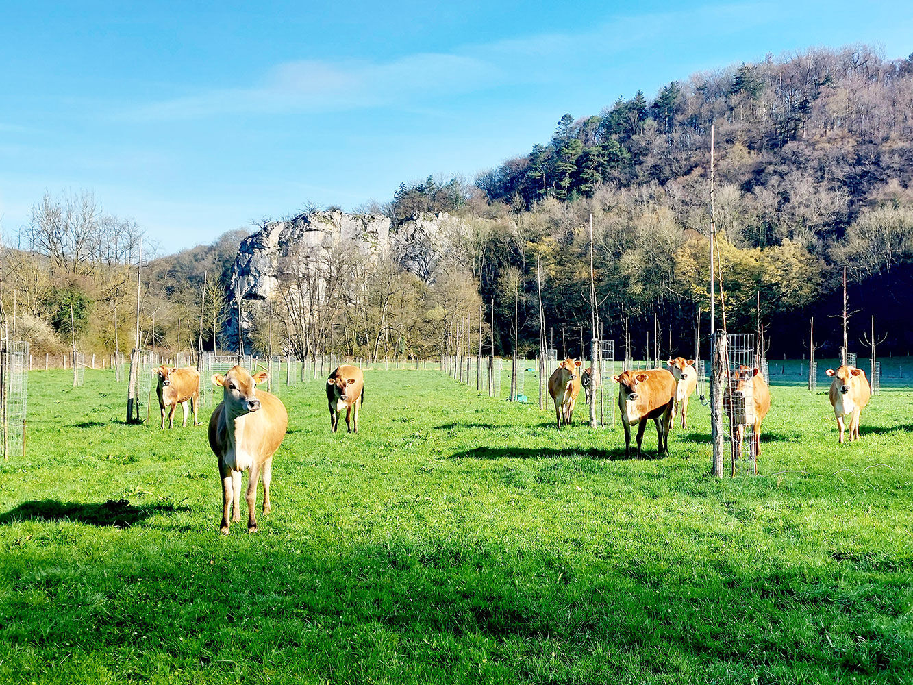 Découverte : visites guidées (vaches, veaux, salle de traite, pondeuses en poulailler mobile, serres de fraises, verger et biodiversité).