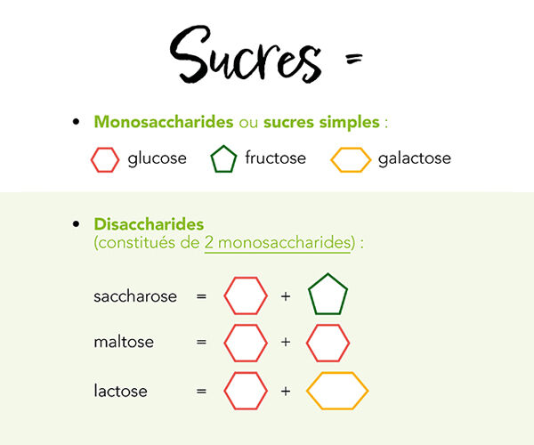 • Des disaccharides (constitués de deux monosaccharides) : saccharoses (glucose-fructose), maltose (glucose-glucose), lactose (glucose-galactose).
