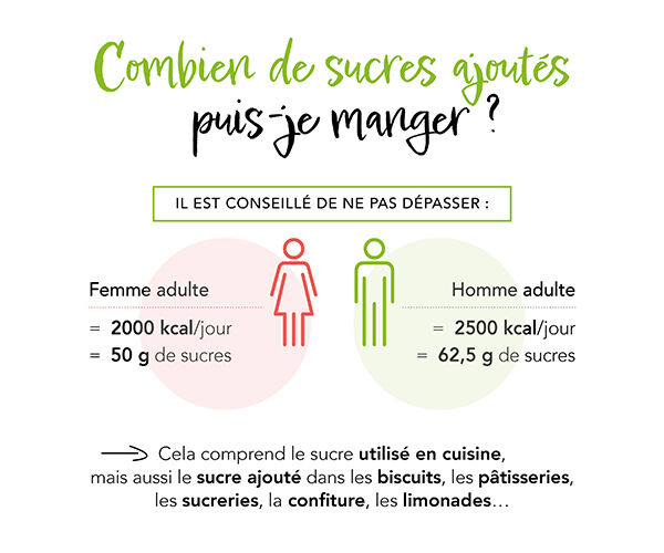 • Pour une femme adulte consommant 2000 kcal par jour : max 50 g de sucres ajoutés, soit l’équivalent de 8,3 morceaux de sucre.