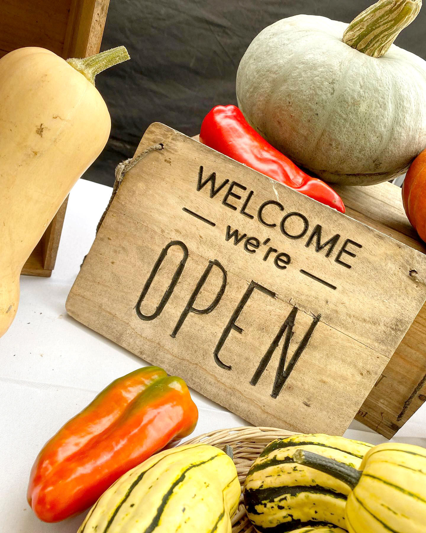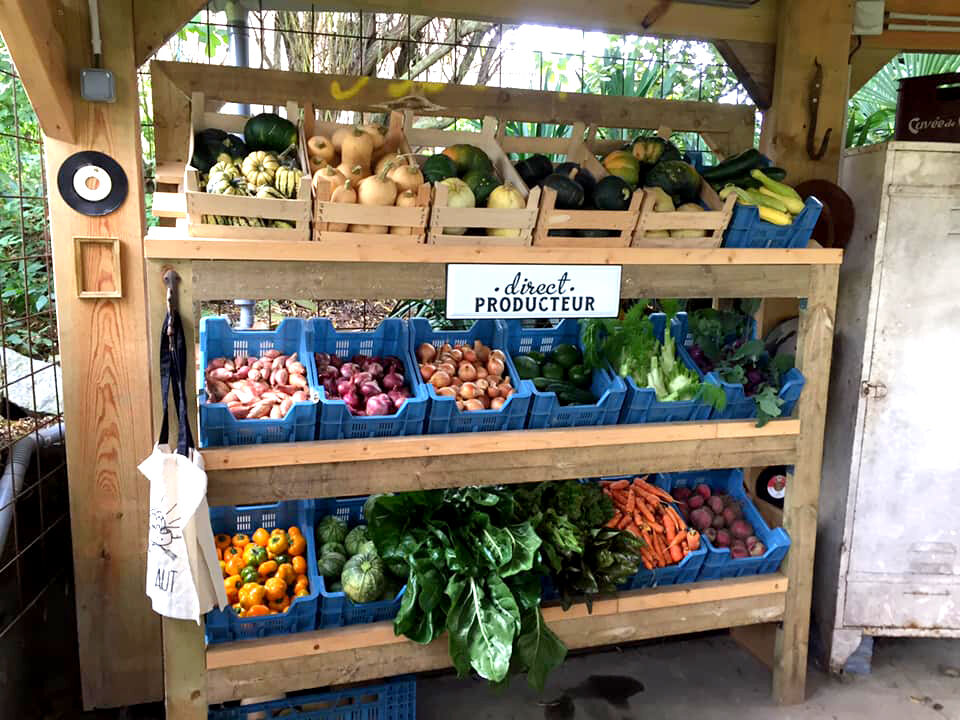 Vente à la ferme. Légumes de saison, frais, récoltes du jour.