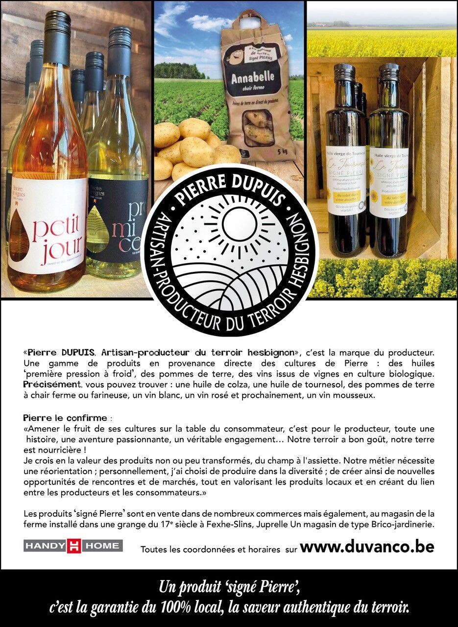 A la ferme, vous trouverez une mini épicerie installée au coeur de la vieille grange. On vous y présentera les produits « Pierre Dupuis, artisan-producteur du terroir Hesbignon ». Actuellement, il s’agit de « La pomme de terre » signé Pierre et l’huile de colza « Le colza » signé Pierre. Ceci est un début. Les premières vendanges de 2021 composeront « Histoire de vignes » signé Pierre ! Parce que… Amener le fruit de ses cultures sur la table du consommateur, c’est pour le producteur, toute une histoire, une aventure passionnante, un véritable engagement. Pierre fournit également de nombreux commerces de la région. Au magasin de la ferme, on se fera le plaisir de vous informer. A très bientôt !