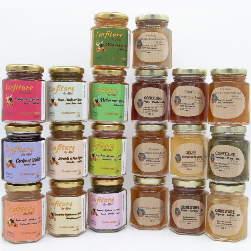 Nous vous proposons des produits à base de miel. Toutes nos créations sont issues de nos propres recettes et nous remplaçons au maximum le sucre par le miel. Cela nous permet d’avoir un final avec moins de « sucre » puisque le miel donne une impression de très sucré avec une plus petite quantité. Vous pourrez donc retrouver des confitures au miel très originales (légumes et fruits), la moutarde au miel, les fruits au jus de miel, l’ail fermenté, le vinaigre de miel, les confiseries au miel, la pâte à tartiner (miel-noisettes), le caramel beurre salé au miel, la cire pour meubles (sur demande)… D’autres produits sont encore en test et intégreront notre gamme au fur et à mesure.