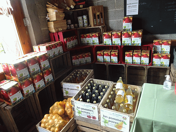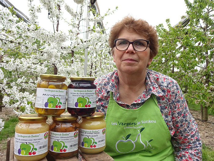 Dans notre magasin à la ferme, la famille Snoeck vous propose : pommes et poires bien sûr mais en plus rhubarbe, cerises, groseilles vertes, prunes, … en vrac, en jus, en bocaux.