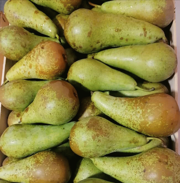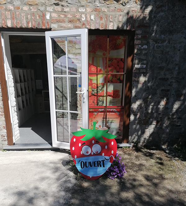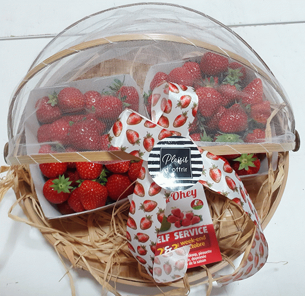 Fruits frais : pommes, poires, fraises.