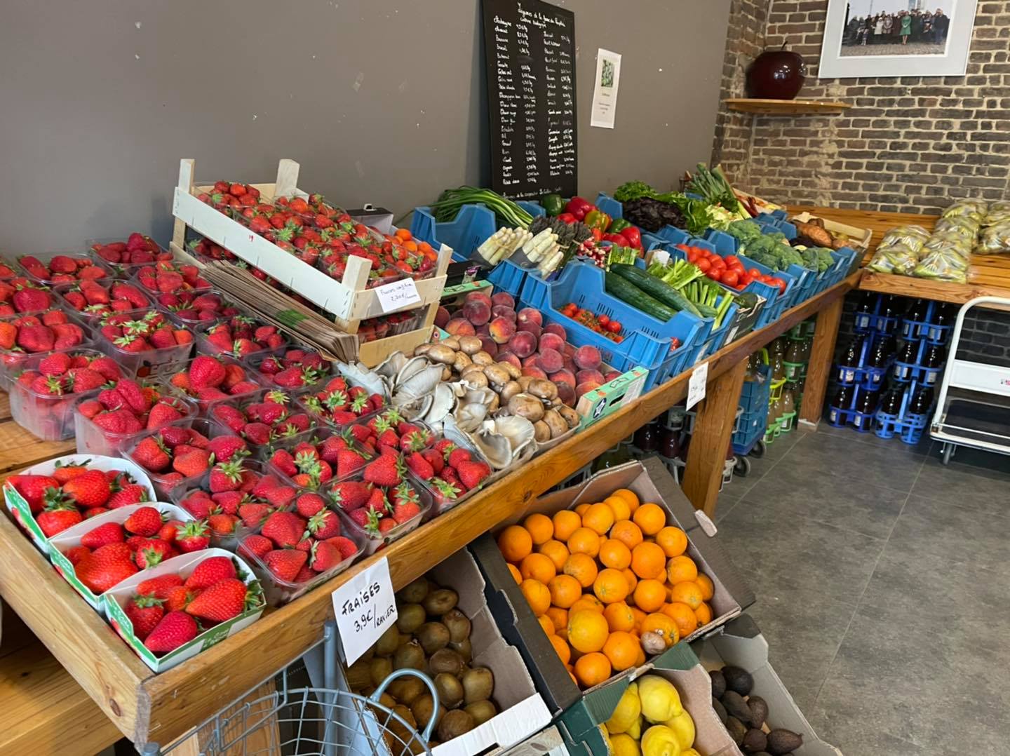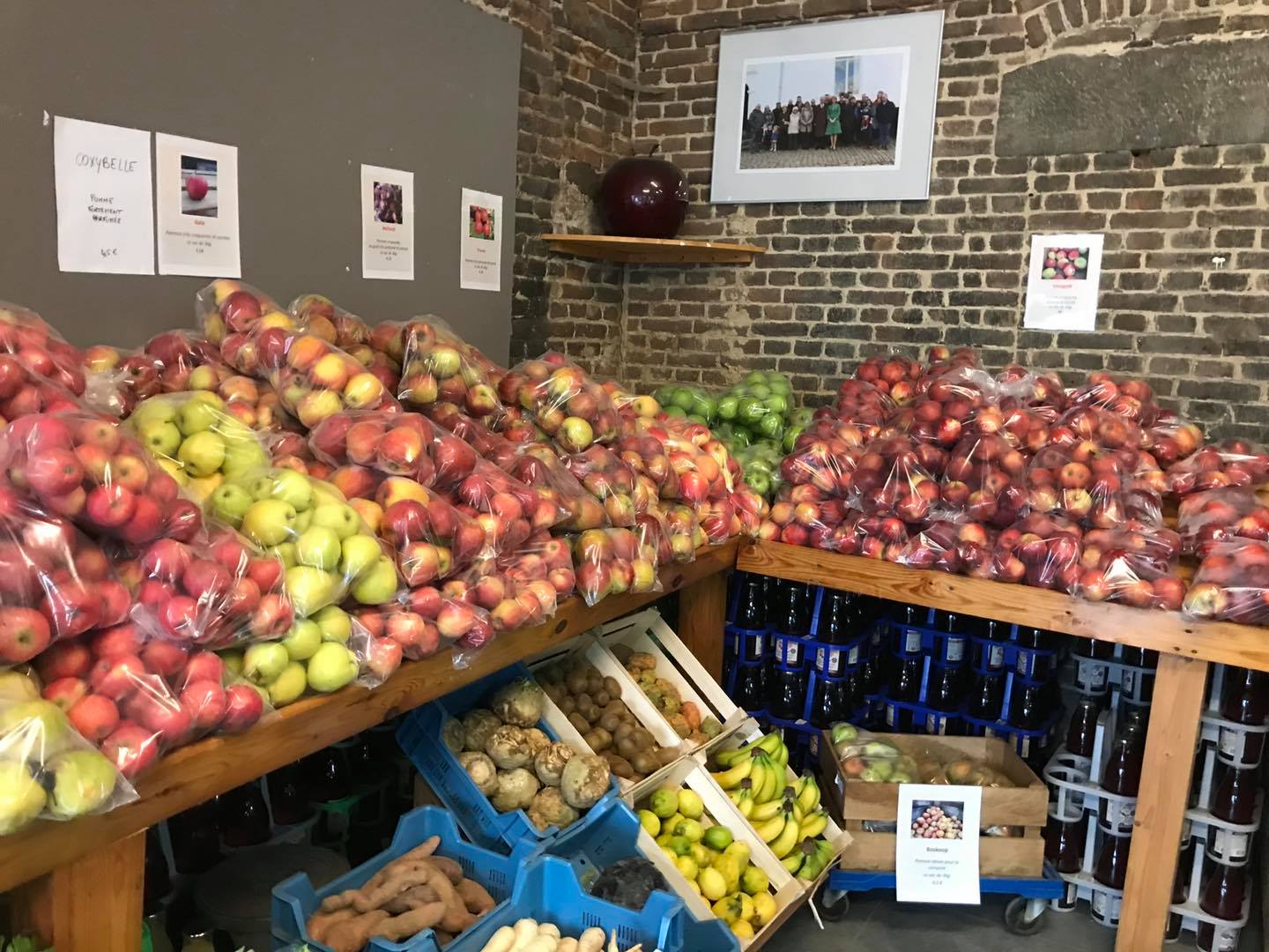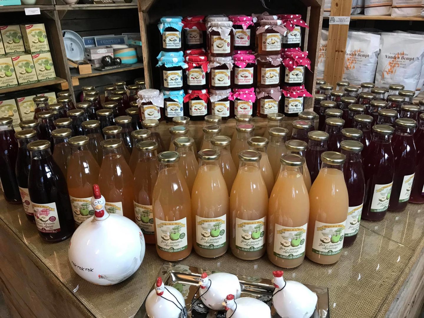 Notre petit magasin à la ferme regorge aujourd’hui de bons produits du coin : fruits, jus, légumes, volailles plein air, miels, confitures, sirops, vinaigres, huiles, pomme de terre, fromages, beurre, youghourts, tarte al djote, bonbons,… (et la liste est encore bien longue !). C’est l’occasion de se mettre au local ! (et pourquoi pas de gâter vos proches avec un de nos paniers cadeaux ?)