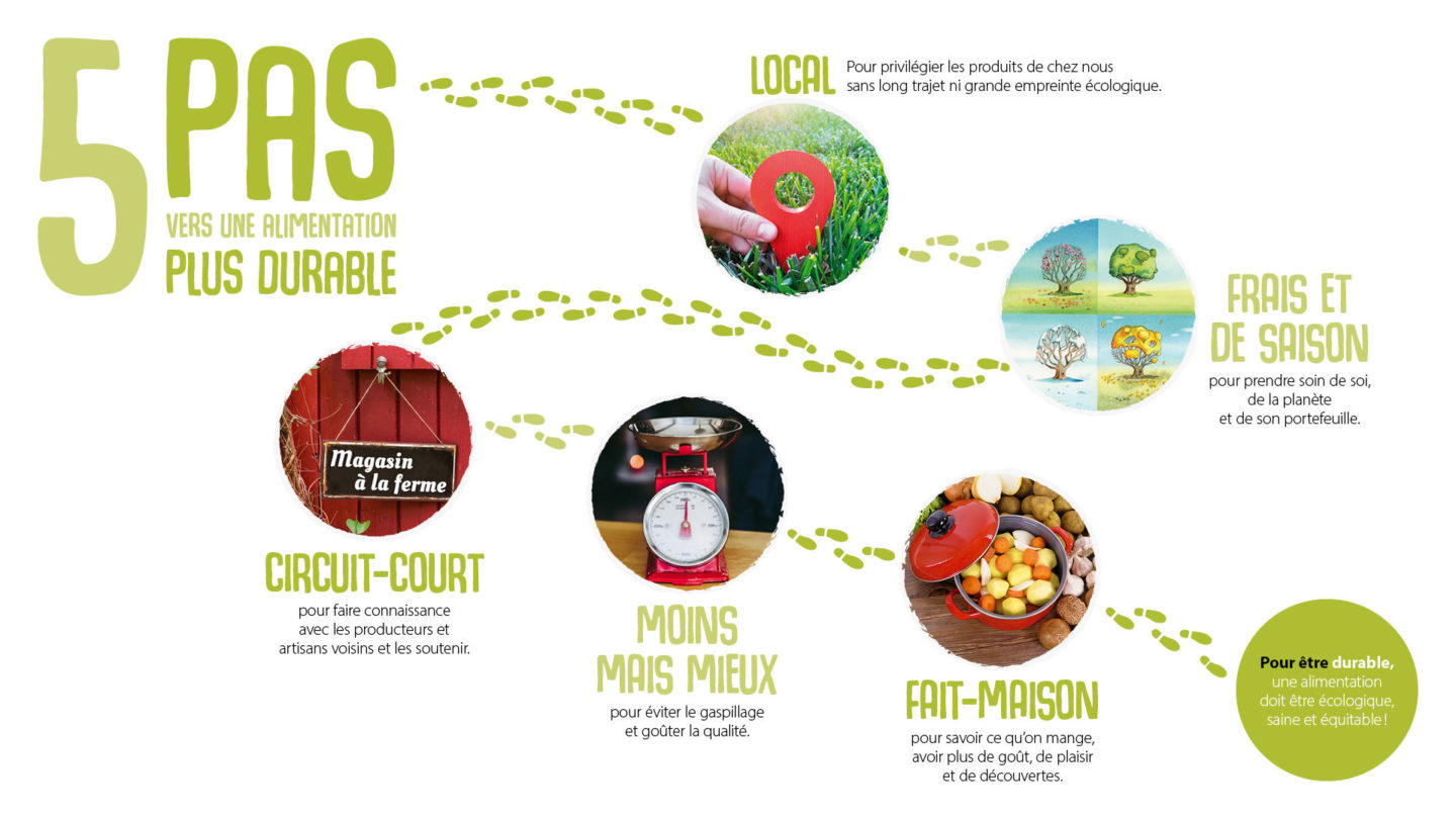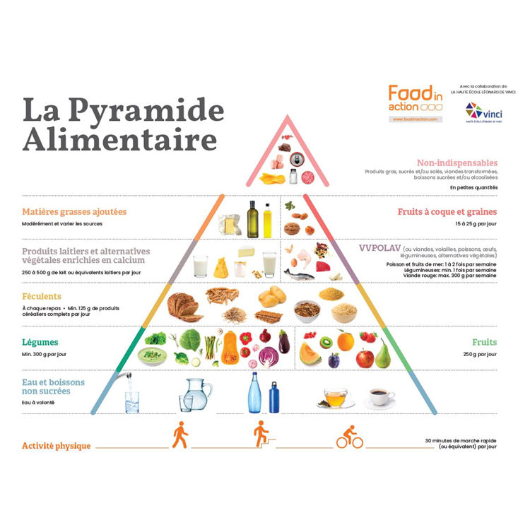 La « Pyramide Alimentaire », que nombre d’entre nous ont appris à connaitre à l’école, a aussi évolué de manière à refléter la prise en compte de la durabilité. Outre les adaptations des familles alimentaires, des portions recommandées, la durabilité ressort plus dans le graphisme : les aliments sont représentés sous forme moins transformée (aliments « bruts »), la priorité est donnée aux fruits et légumes produits en Belgique ou en Europe (la banane et l’avocat ne sont plus illustrés), les emballages en plastique ont disparu… Le fait de privilégier les aliments produits chez nous permet d’éviter des transports inutiles.